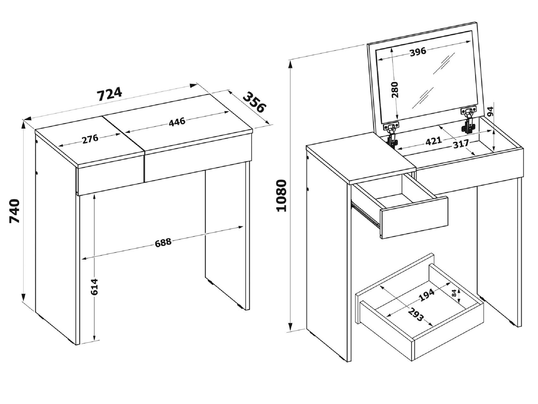 Туалетный стол СП-22 - это стол для макияжа с выдвижным ящиком, откидной крышкой столешницы с зеркалом и нишей под ней. В сложенном виде письменный стол или стол для ноутбука.