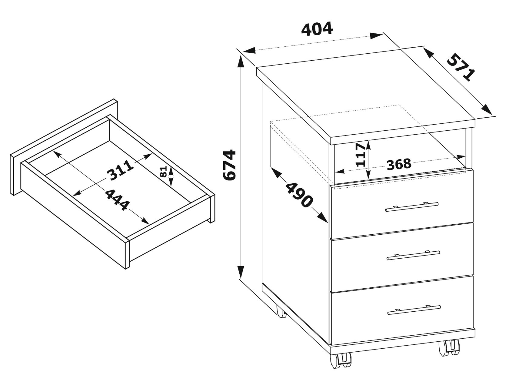 Размер тумбы: В-674 мм, Ш-404 мм, Г-571 мм.