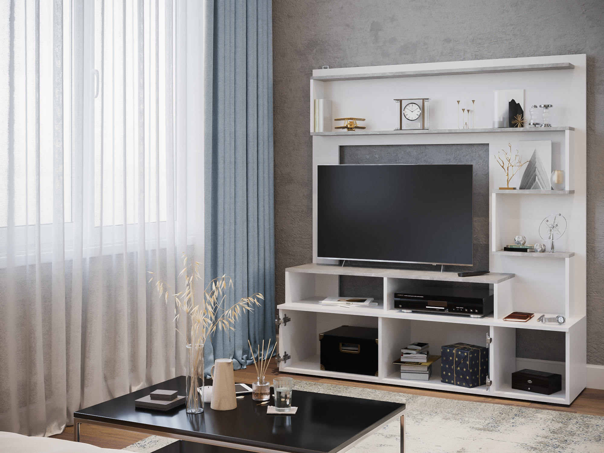 Конструкция гостиной «Юджи» включает в себя минимум предметов и максимум пользы в сочетании с внешней выдержанностью и простотой. Верхнюю и расположенные сбоку открытые полки можно использовать под сувениры и фотографии и оригинальные аксессуары. можно выигрышно расставить цветы и иные аксессуары для интерьера. Важной частью «Юджи» является ниша, на которую вы можете установить 40 дюймовый телевизор. Обустройте зону для приятного времяпрепровождения при просмотре шоу, сериалов и фильмов.