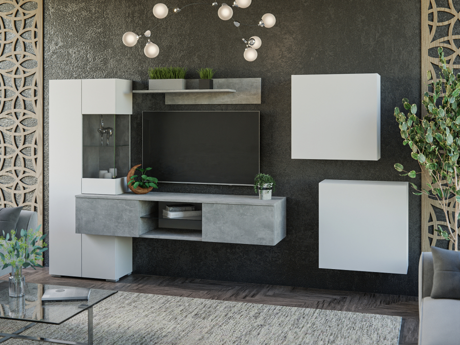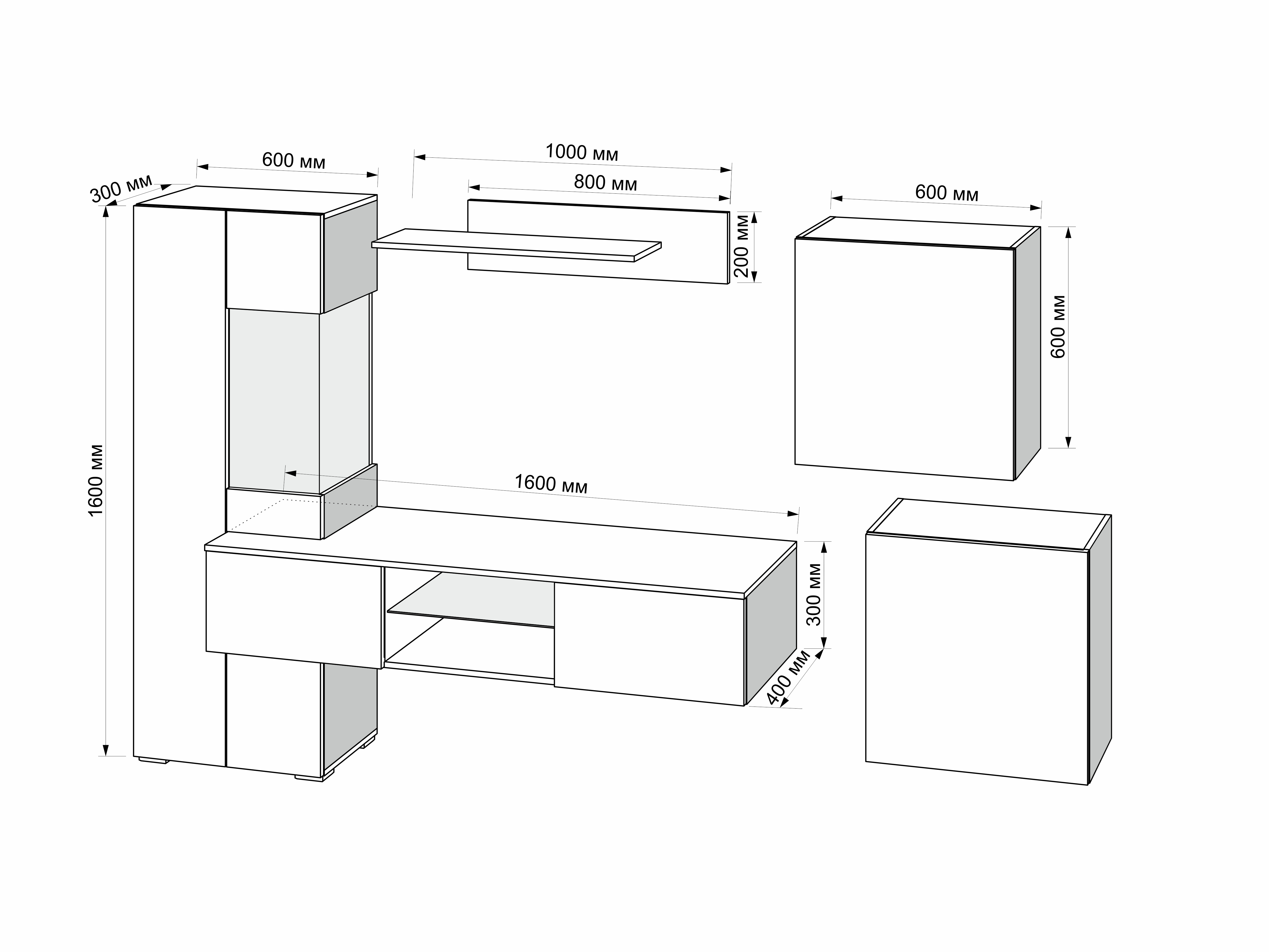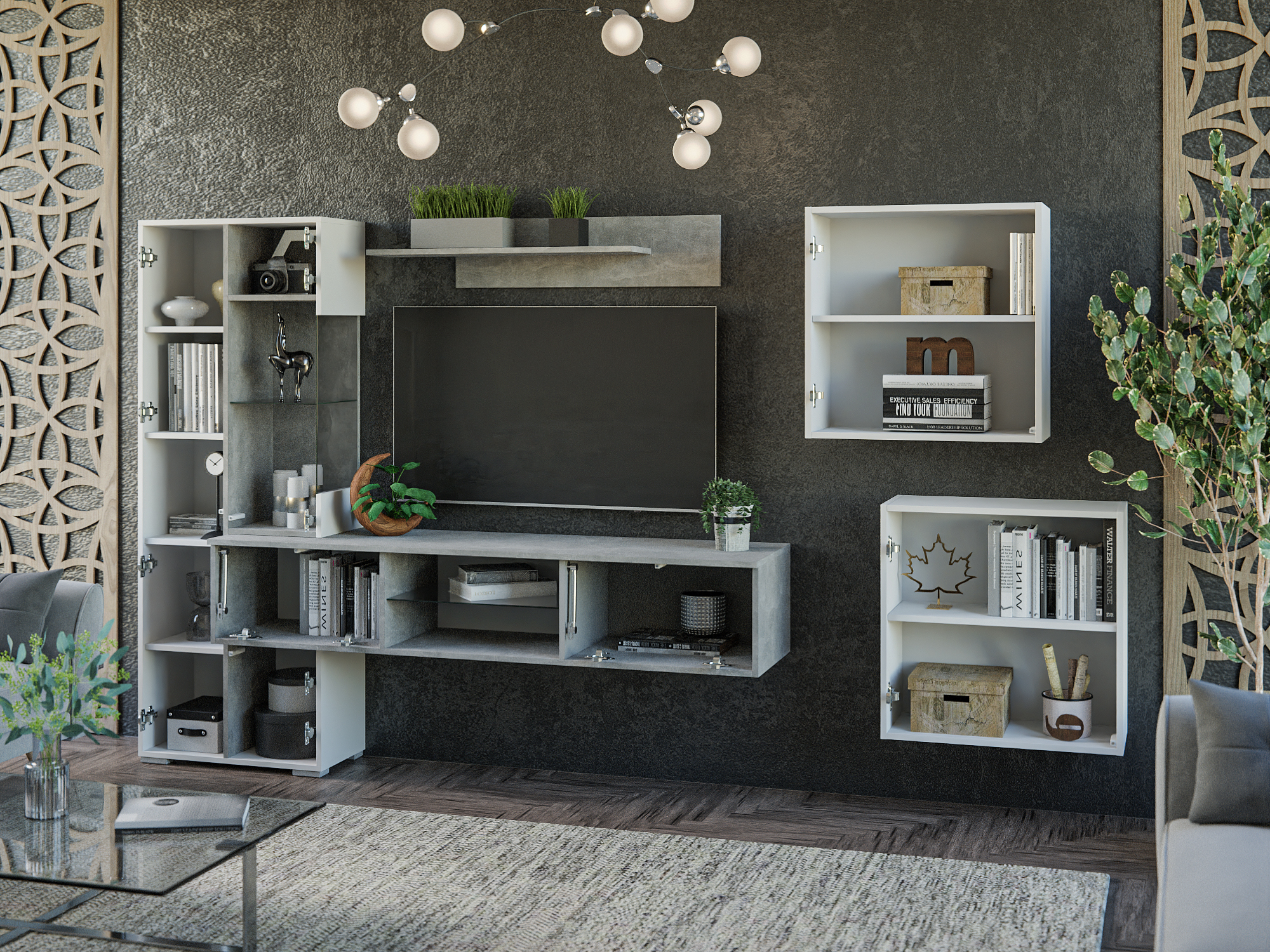 Гостиная «Минель» имеет необычную конфигурацию и представлена следующими элементами: два навесных шкафчика в форме квадрата, верхняя полка открытого типа, шкаф-витрина вертикального расположения и навесной шкаф горизонтального расположения.