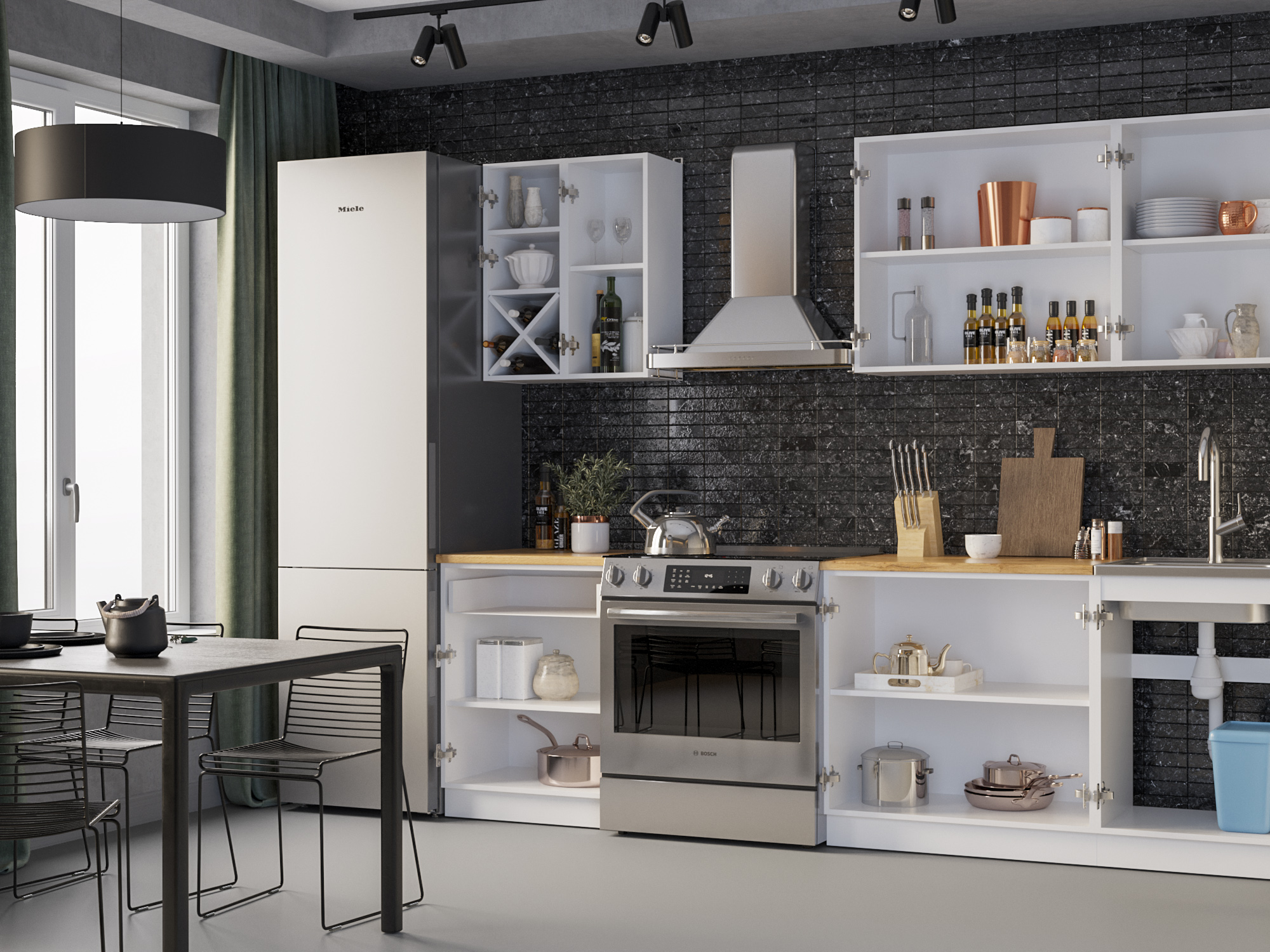 Кухня оснащена шкафом со встроенной мойкой. Шкаф послужит дополнительным место для хранения или для размещения мусорного контейнера.