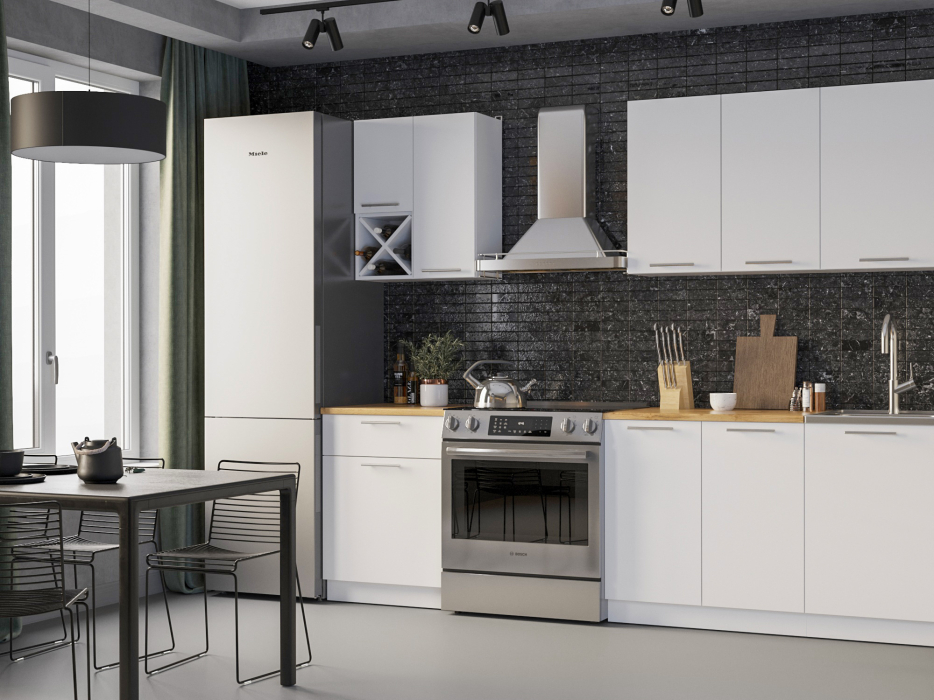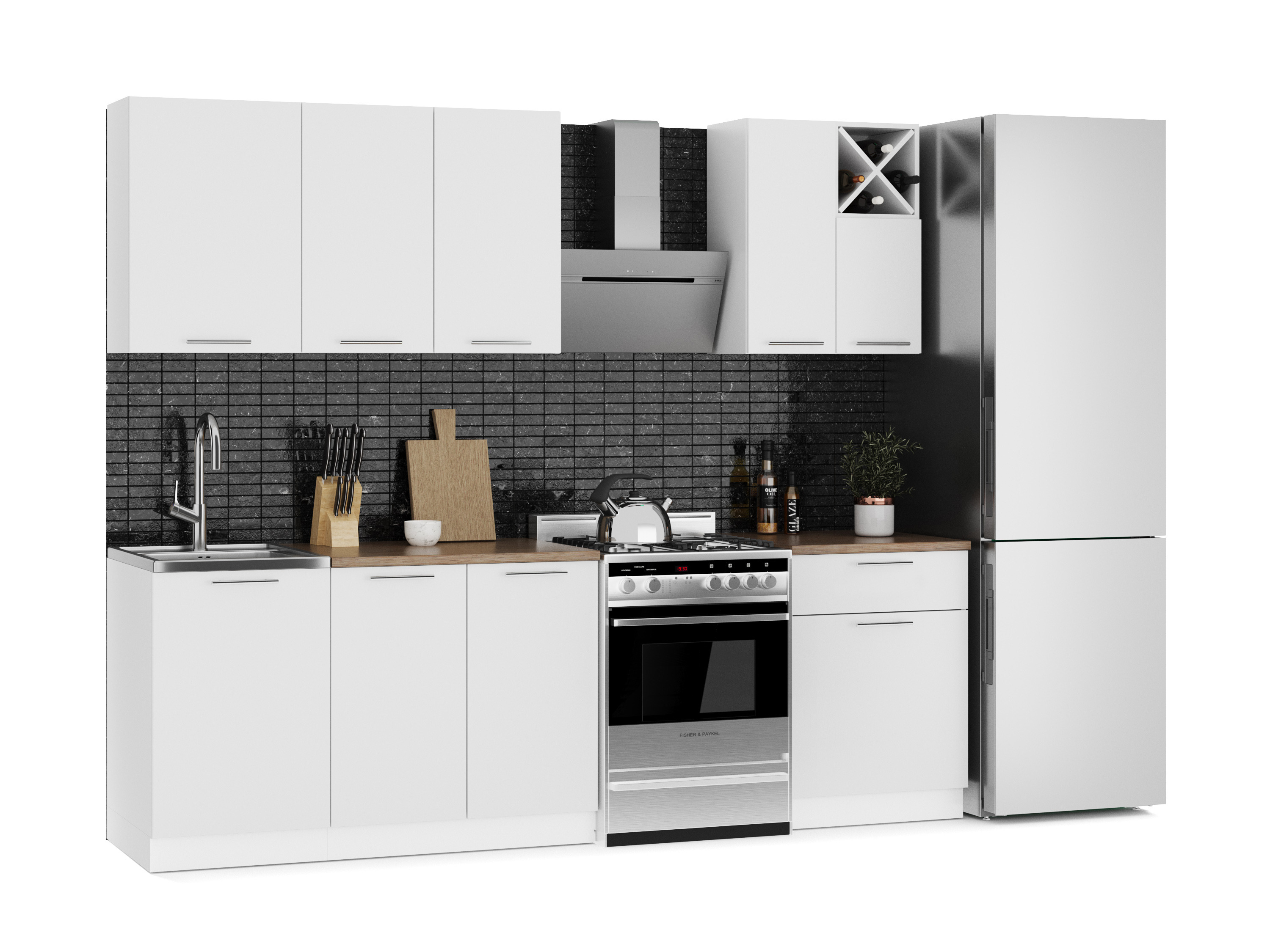 Верхний модуль кухни «Милана» состоит из 5 шкафов. 4 шкафа предназначены для хранения посуды, специй и круп. Секция с винницей является «изюминкой» кухни.