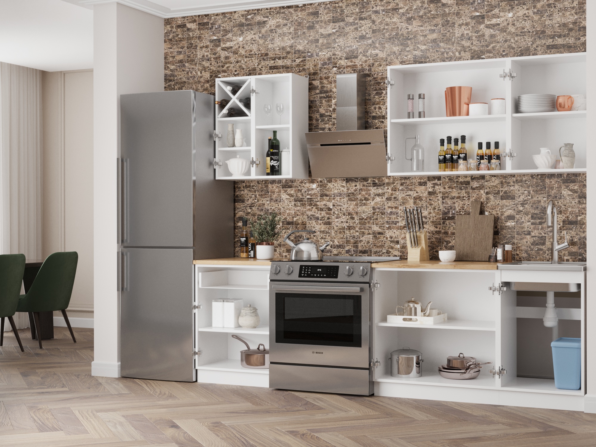 Кухня оснащена шкафом со встроенной мойкой. Шкаф послужит дополнительным место для хранения или для размещения мусорного контейнера.
