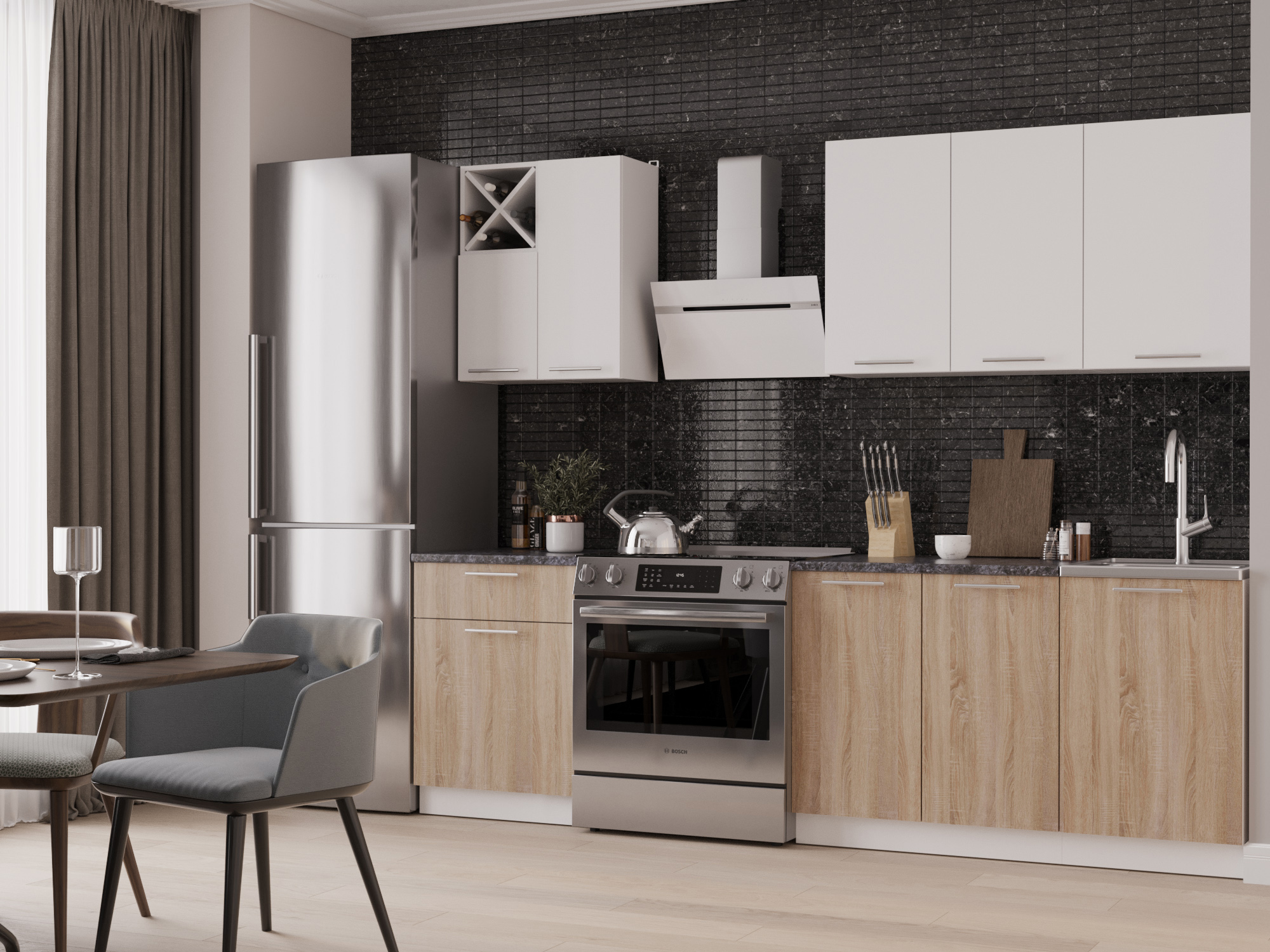 Верхний модуль кухни «Милана» состоит из 5 шкафов. 4 шкафа предназначены для хранения посуды, специй и круп. Секция с винницей является «изюминкой» кухни.