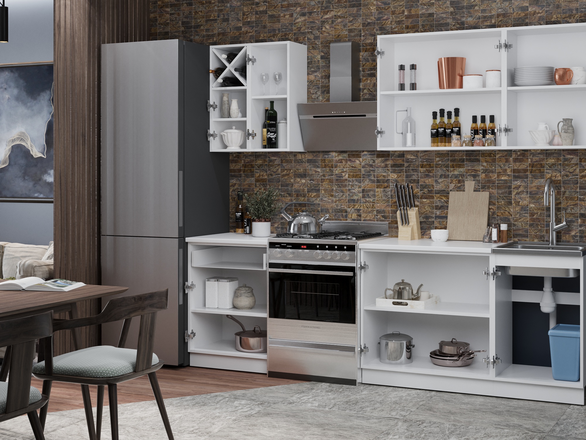 Верхний модуль кухни «Милана» состоит из 5 шкафов. 4 шкафа предназначены для хранения посуды, специй и круп. Секция с винницей является «изюминкой» кухни.
