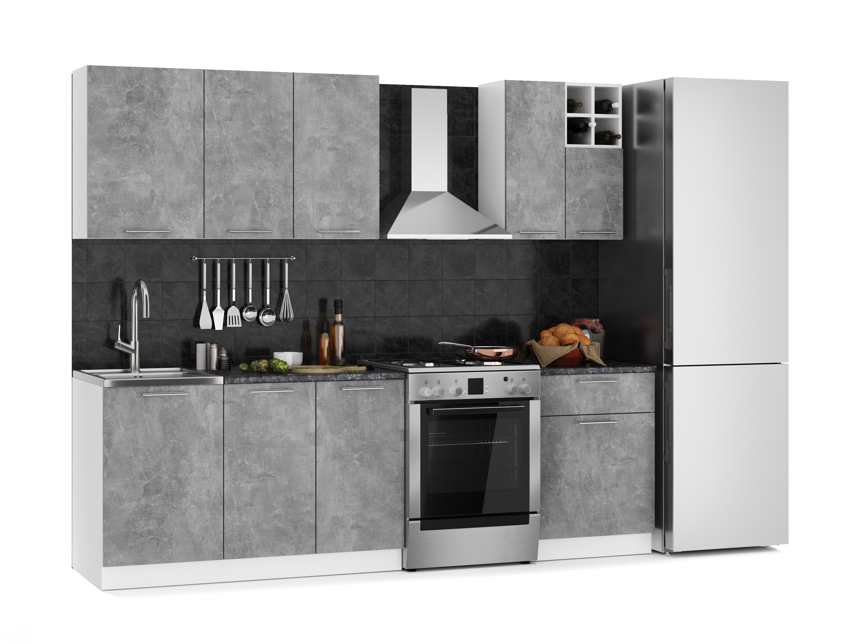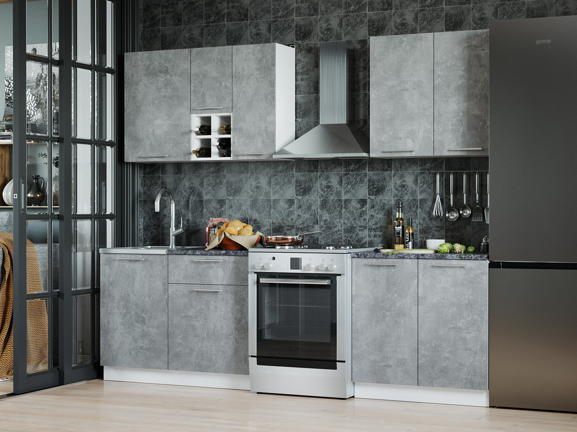 У кухни «Глория» предусмотрен шкаф со встроенной мойкой. Внутри шкафа есть место для хранения кухонной утвари и инвентаря.