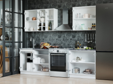 Секция со встроенной варочной панелью и духовым шкафом оснащена выдвижным ящиком для хранения. С правой стороны от варочной панели размещён шкаф, который разделён на две части: выдвижной ящик для хранения столовых приборов и секция для хранения посуды.