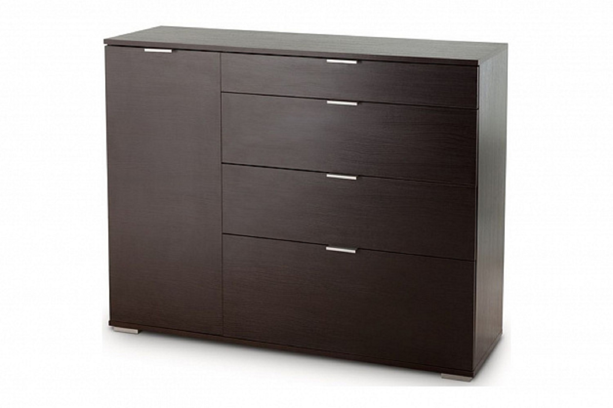 Конструкция с 4-я выдвижными ящиками и отделением с дверцей. Ящики разной глубины. Ящики установлены на шариковые направляющие.