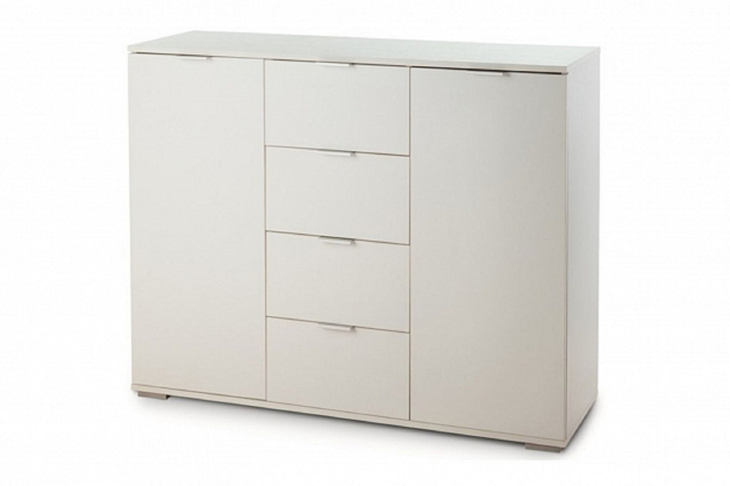 У комода четыре выдвижных ящика для одежды и аксессуаров и две распашные дверцы с двумя полками за каждой. Ящики установлены на шариковые направляющие.