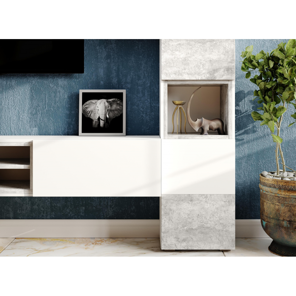 Стеллаж Лонгфорд белый четырьмя дверцами и нишей, узкий. Материал каркаса: ЛДСП. Цвет каркаса: Белый / бетон светлый. Сочетание белого цвета и бетона подойдёт ко многим лофтовым вариантам интерьера