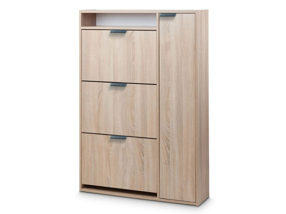 Модель способна разместить до двенадцати пар обуви. С правой стороны за распашной дверцей располагаются три полки. Слева 3-и откидные секции для обуви и открытая полочка для мелочей.