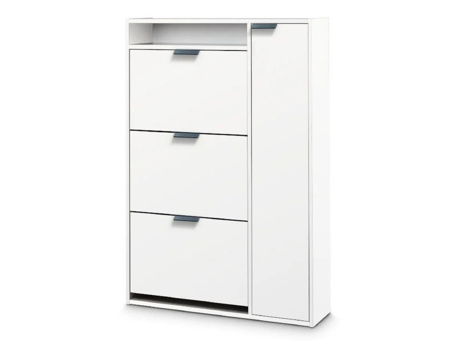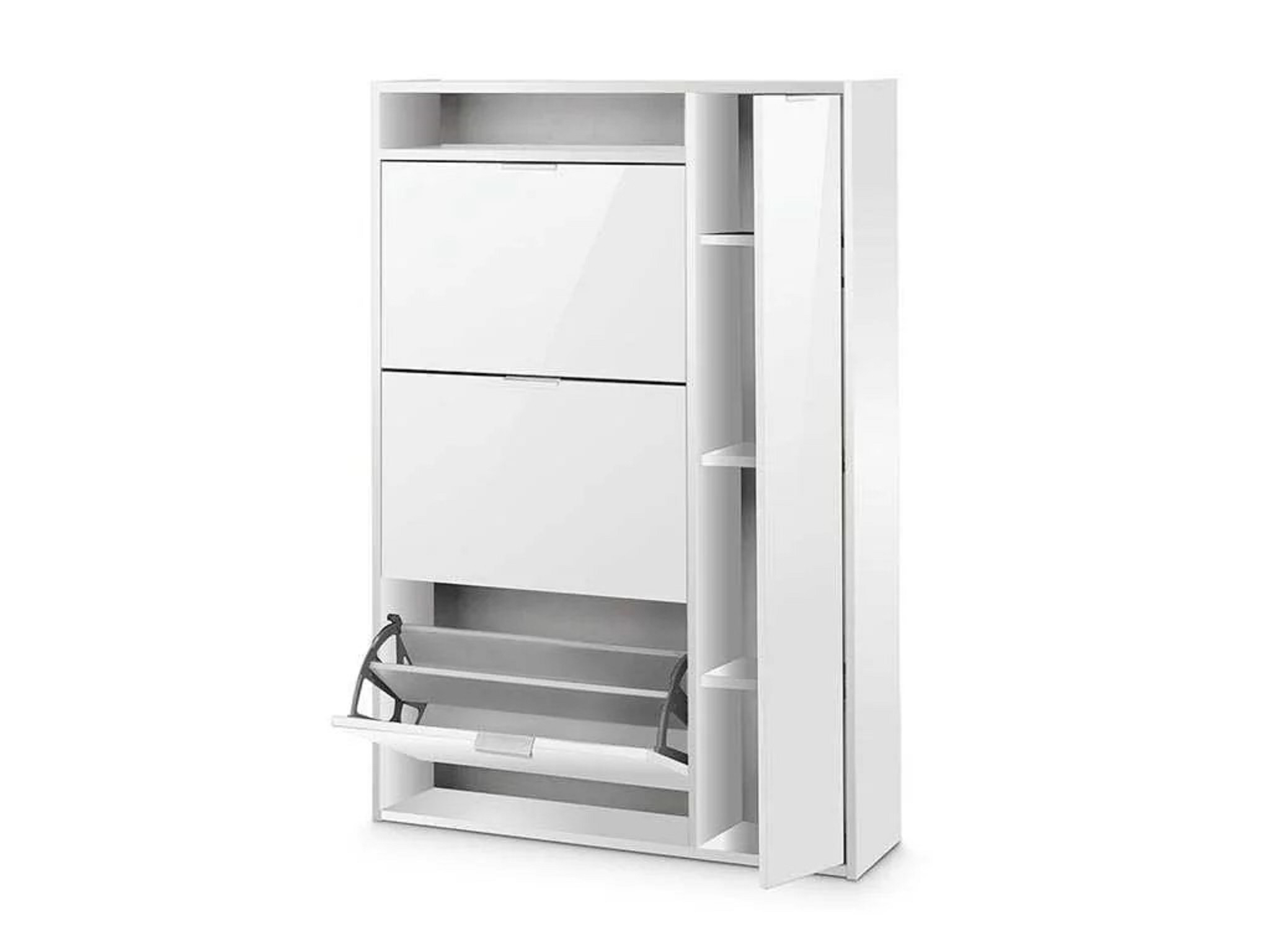 Модель способна разместить до двенадцати пар обуви. С правой стороны за распашной дверцей располагаются три полки. Слева 3-и откидные секции для обуви и открытая полочка для мелочей.