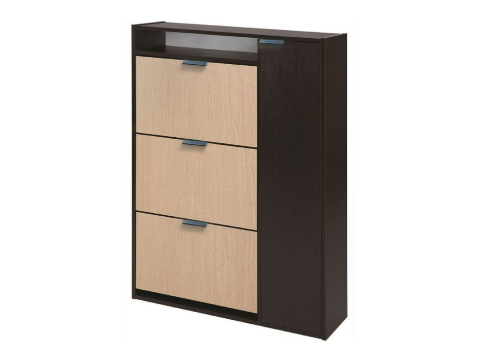 Модель способна разместить до двенадцати пар обуви. С правой стороны за распашной дверцей располагаются три полки. Слева 3-и откидные секции для обуви и открытая полочка для мелочей.