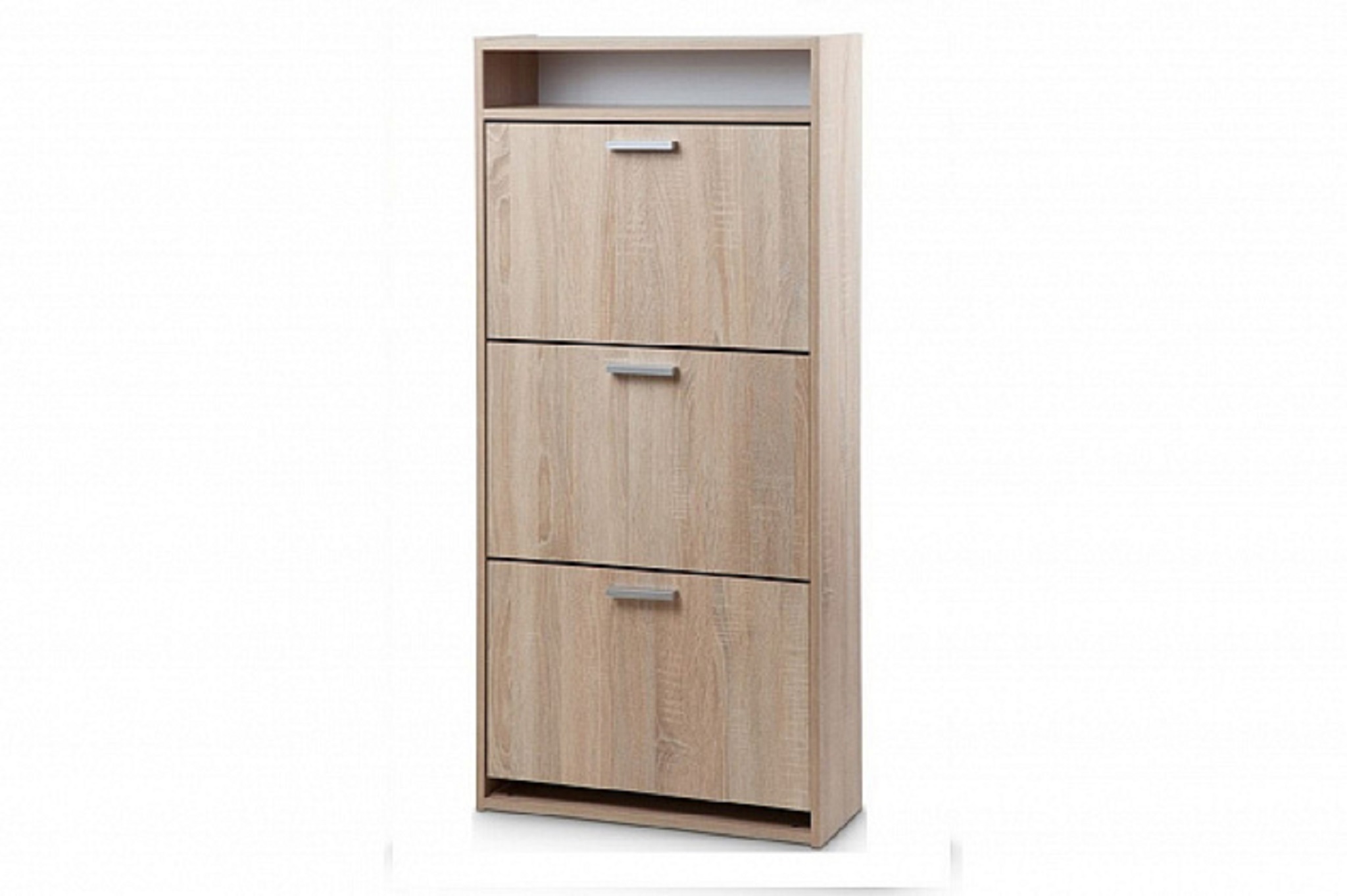 Модель отличается малой глубиной, что позволит разместить ее в любом удобном месте. Тумба оборудована 3я откидными секциями для хранения обуви. Вверху имеется открытая полочка для ключей.
