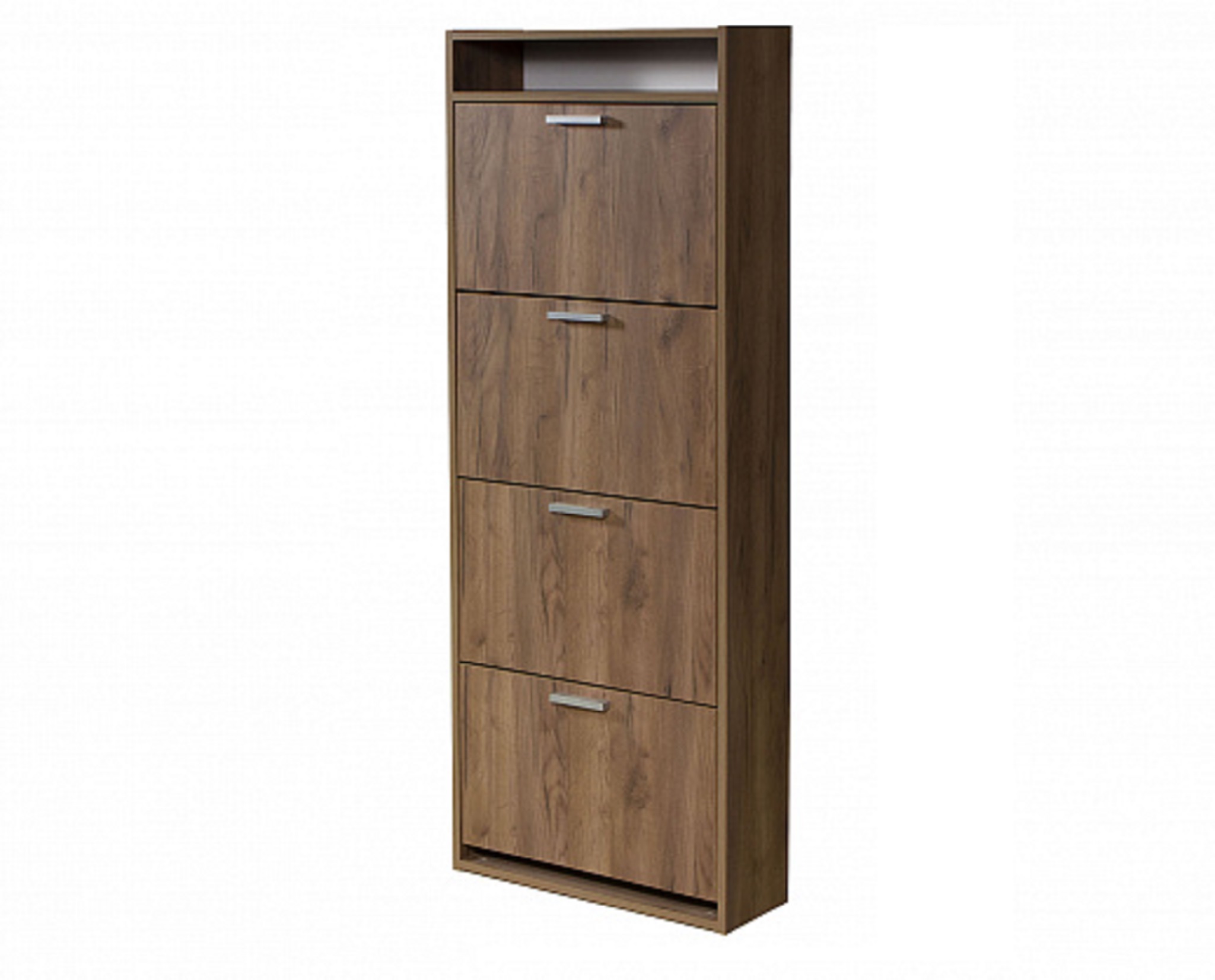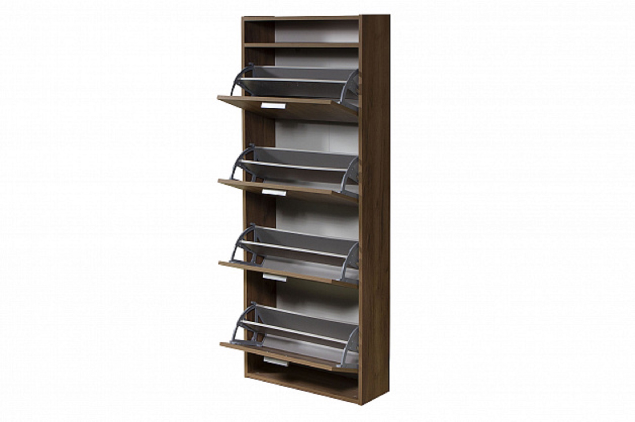 Модель отличается малой глубиной, что позволит разместить ее в любом удобном месте. Четыре отделения для хранения обуви представляют собой откидные секции-обувницы. Вверху имеется открытая полочка для ключей.