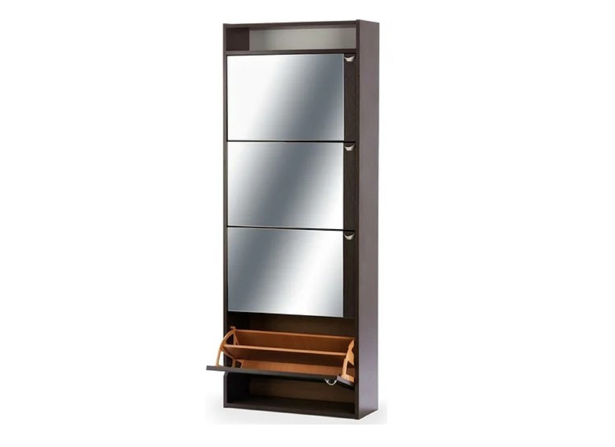 Модель отличается малой глубиной, что позволит разместить ее в любом удобном месте. Четыре отделения для хранения обуви представляют собой откидные секции-обувницы. Вверху имеется открытая полочка для ключей.