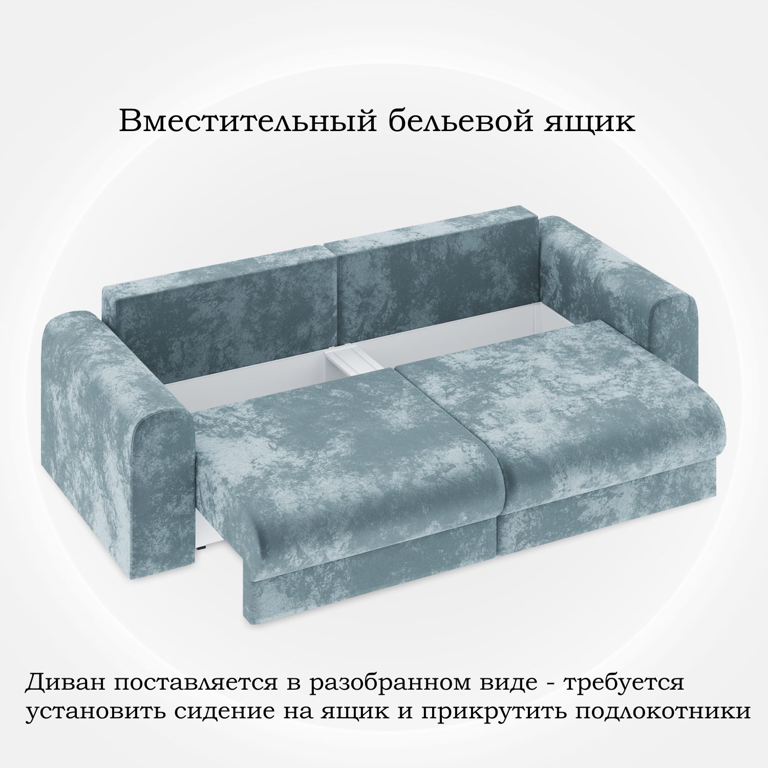 Диван поставляется в разобранном виде - требуется установить сидение на ящик и прикрутить подлокотники.