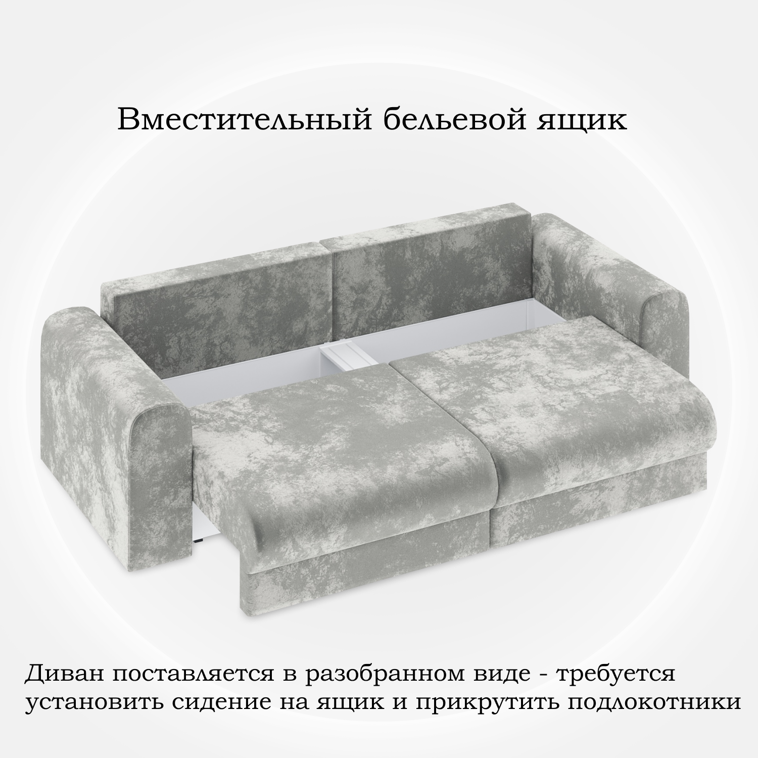 Диван поставляется в разобранном виде - требуется установить сидение на ящик и прикрутить подлокотники.