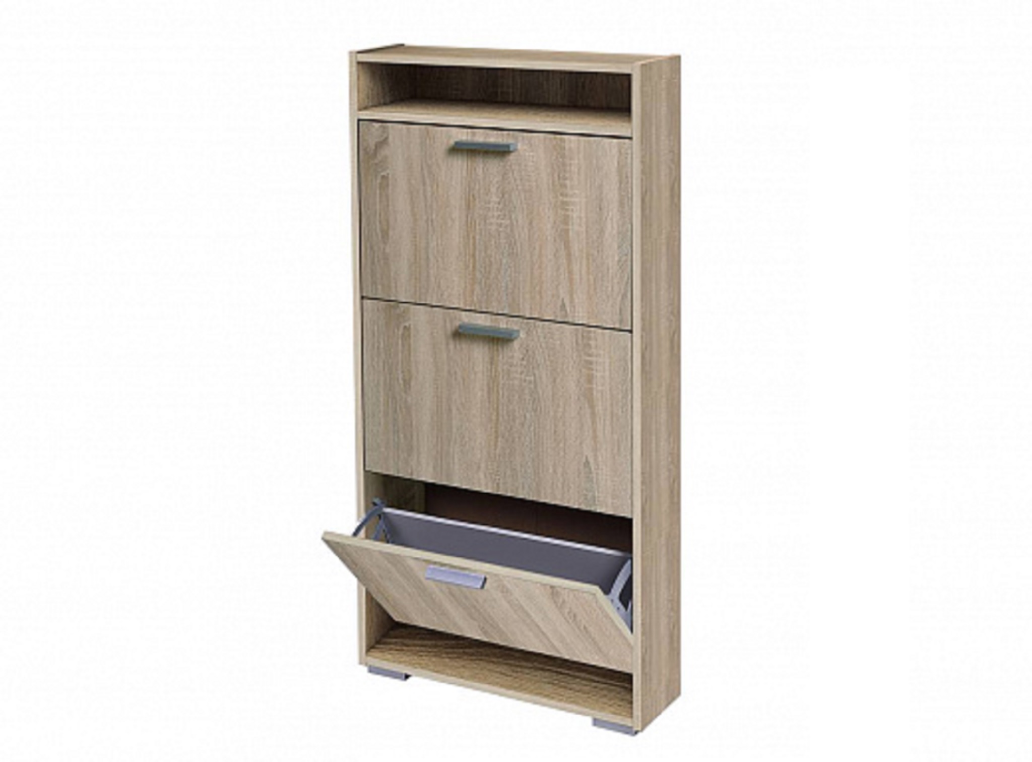 Модель отличается малой глубиной, что позволит разместить ее в любом удобном месте. Тумба оборудована 3я откидными секциями для хранения обуви. Вверху имеется открытая полочка для ключей.