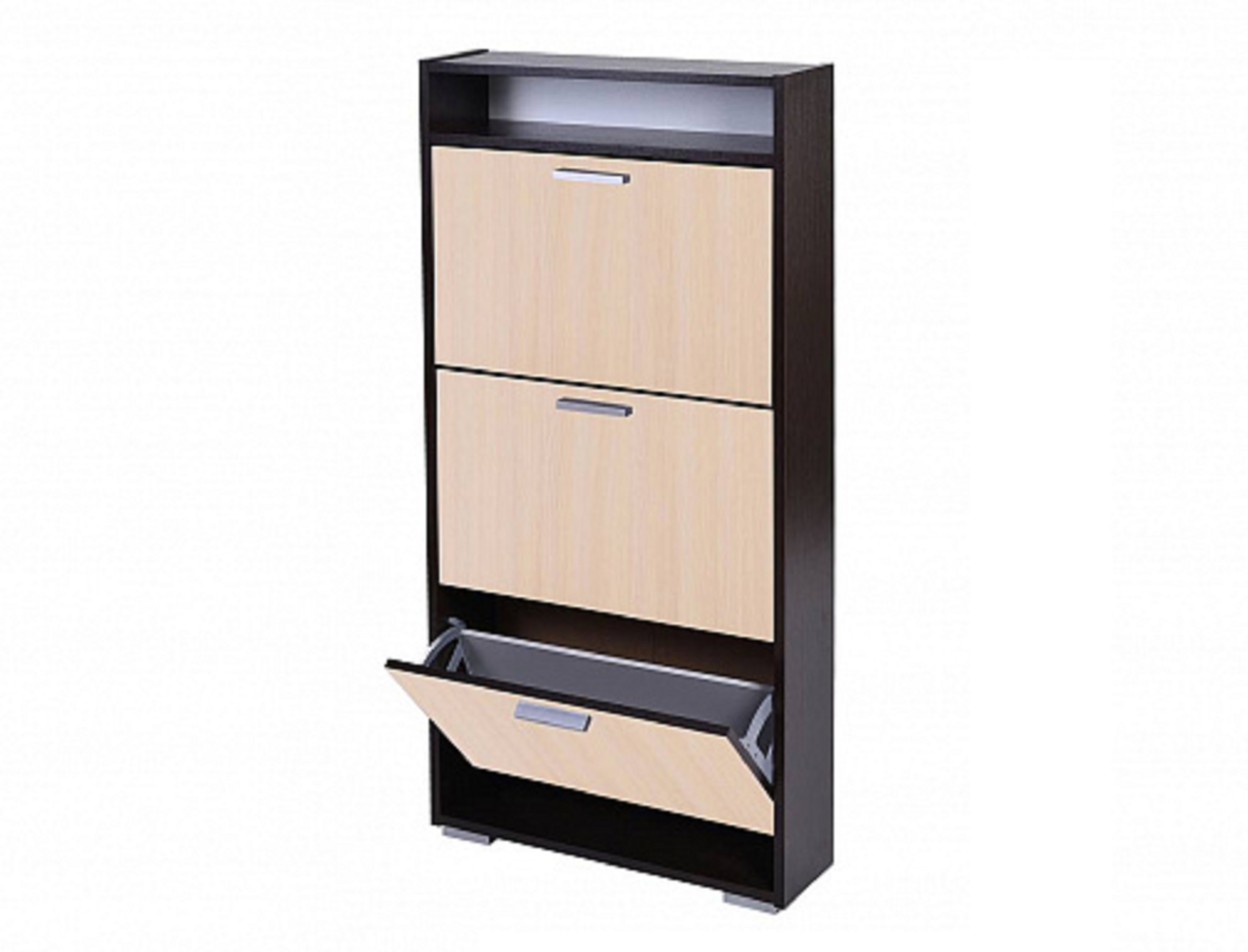 Модель отличается малой глубиной, что позволит разместить ее в любом удобном месте. Тумба оборудована 3я откидными секциями для хранения обуви. Вверху имеется открытая полочка для ключей.