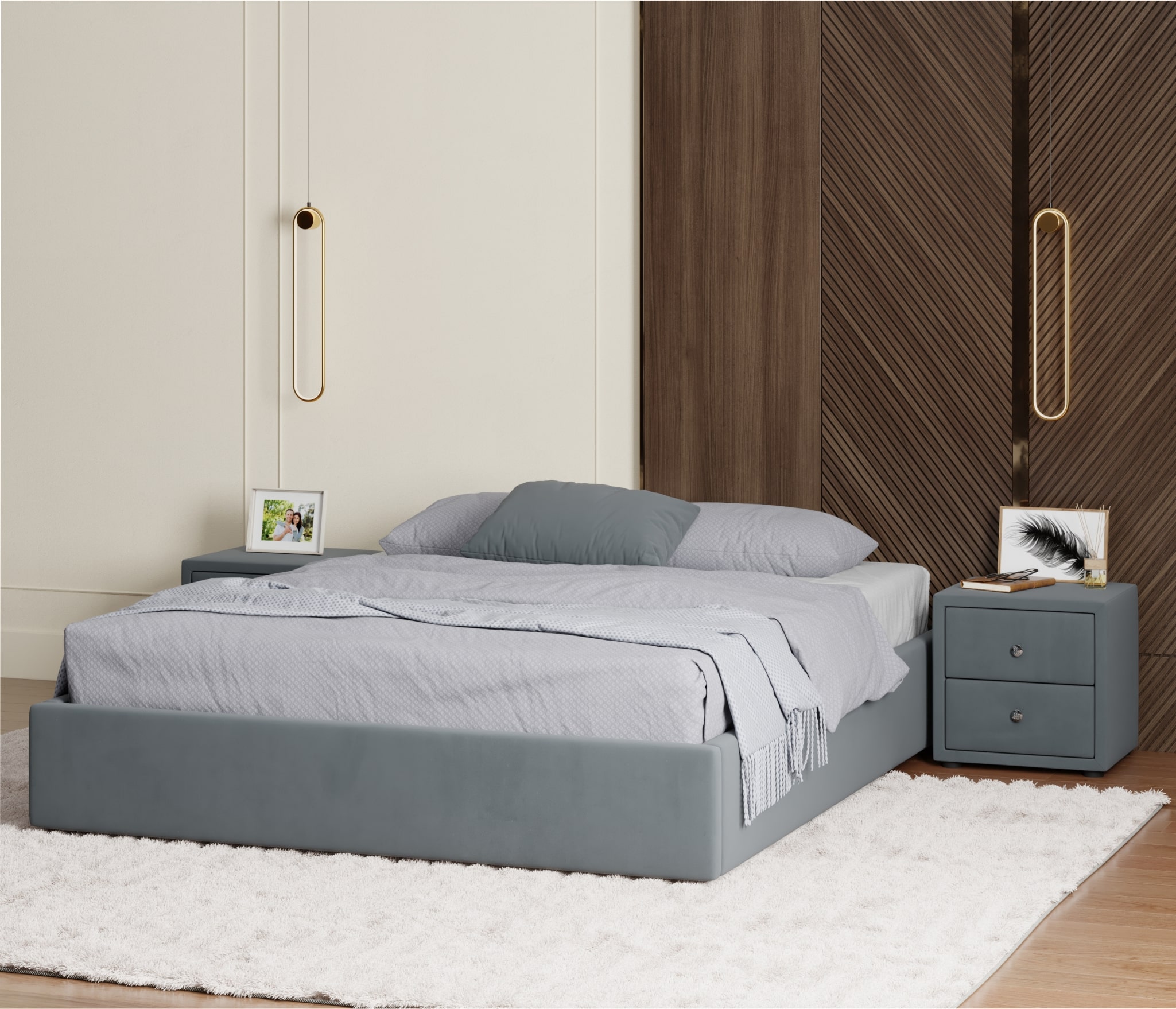 Весь периметр 2 спальной кровати выполнен из мебельной ткани – велюр. Это уникальный материал, который получается за счет сплетения пяти волокон одновременно. Дорогая ткань велюр придает кровати более величественный благородный вид. Ткань износостойкая, легко чиститься от загрязнений.