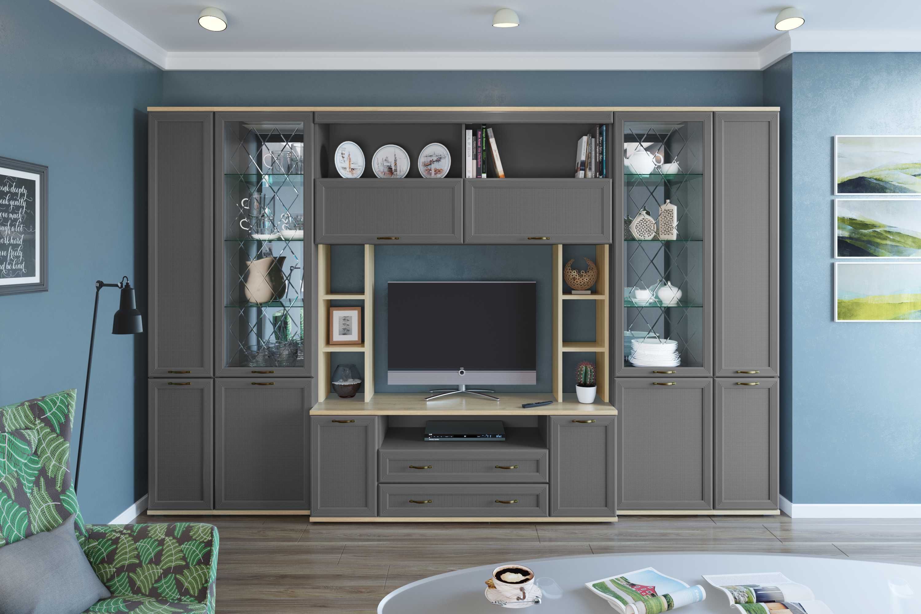 Корпусная мебель для гостиной "Карина" - это модульная мебель. Коллекция включает в себя более 70-ти оригинальных модулей, созданная с их помощью композиция отлично впишется в любое помещение. Программа «Карина» позволит создать уют и гармонию в гостиной. Фасад имеет уникальное сочетание глубокого тиснения и эффекта патины, присущей классическому стилю. Изящество фасада подчеркивает стекло с алмазной гравировкой и фацетом. Мебель изготавливается из высококачественных материалов: ЛДСП, МДФ (фасад) компании Egger имеют класс эмиссии Е1. Коллекция мебели комплектуется высококачественной европейской фурнитурой. Во всех выдвижных ящиках используются направляющие Quadro фирмы Hettich, которые обеспечат долгую превосходную функциональность. Встроенный демпфер Silent System позволяет закрывать ящик плавно и бесшумно. Скрытый монтаж делает механизм в нижней части ящика невидимым глазу, что позволяет не нарушать элегантный дизайн. Петли с доводчиками фирмы Titus обеспечивают бесшумное закрытие створки.