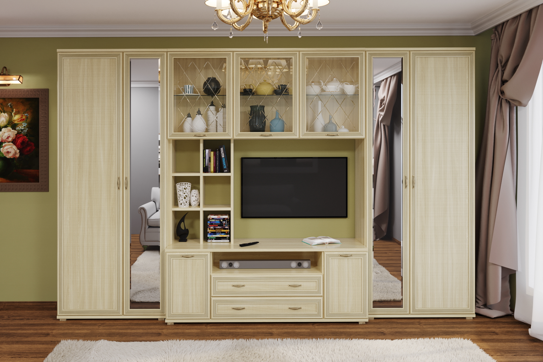 Корпусная мебель для гостиной "Карина" - это модульная мебель. Коллекция включает в себя более 70-ти оригинальных модулей, созданная с их помощью композиция отлично впишется в любое помещение. Программа «Карина» позволит создать уют и гармонию в гостиной. Фасад имеет уникальное сочетание глубокого тиснения и эффекта патины, присущей классическому стилю. Изящество фасада подчеркивает стекло с алмазной гравировкой и фацетом. Мебель изготавливается из высококачественных материалов: ЛДСП, МДФ (фасад) компании Egger имеют класс эмиссии Е1. Коллекция мебели комплектуется высококачественной европейской фурнитурой. Во всех выдвижных ящиках используются направляющие Quadro фирмы Hettich, которые обеспечат долгую превосходную функциональность. Встроенный демпфер Silent System позволяет закрывать ящик плавно и бесшумно. Скрытый монтаж делает механизм в нижней части ящика невидимым глазу, что позволяет не нарушать элегантный дизайн. Петли с доводчиками фирмы Titus обеспечивают бесшумное закрытие створки.