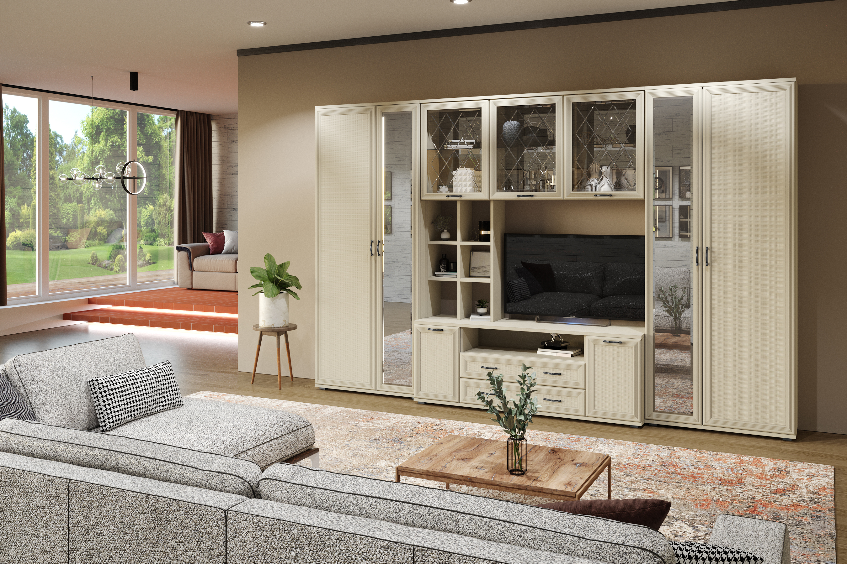 Корпусная мебель для гостиной "Карина" - это модульная мебель. Коллекция включает в себя более 70-ти оригинальных модулей, созданная с их помощью композиция отлично впишется в любое помещение. Программа «Карина» позволит создать уют и гармонию в гостиной. Фасад имеет уникальное сочетание глубокого тиснения и эффекта патины, присущей классическому стилю. Изящество фасада подчеркивает стекло с алмазной гравировкой и фацетом. Мебель изготавливается из высококачественных материалов: ЛДСП, МДФ (фасад) компании Egger имеют класс эмиссии Е1. Коллекция мебели комплектуется высококачественной европейской фурнитурой. Во всех выдвижных ящиках используются направляющие Quadro фирмы Hettich, которые обеспечат долгую превосходную функциональность. Встроенный демпфер Silent System позволяет закрывать ящик плавно и бесшумно. Скрытый монтаж делает механизм в нижней части ящика невидимым глазу, что позволяет не нарушать элегантный дизайн. Петли с доводчиками фирмы Titus обеспечивают бесшумное закрытие створки.