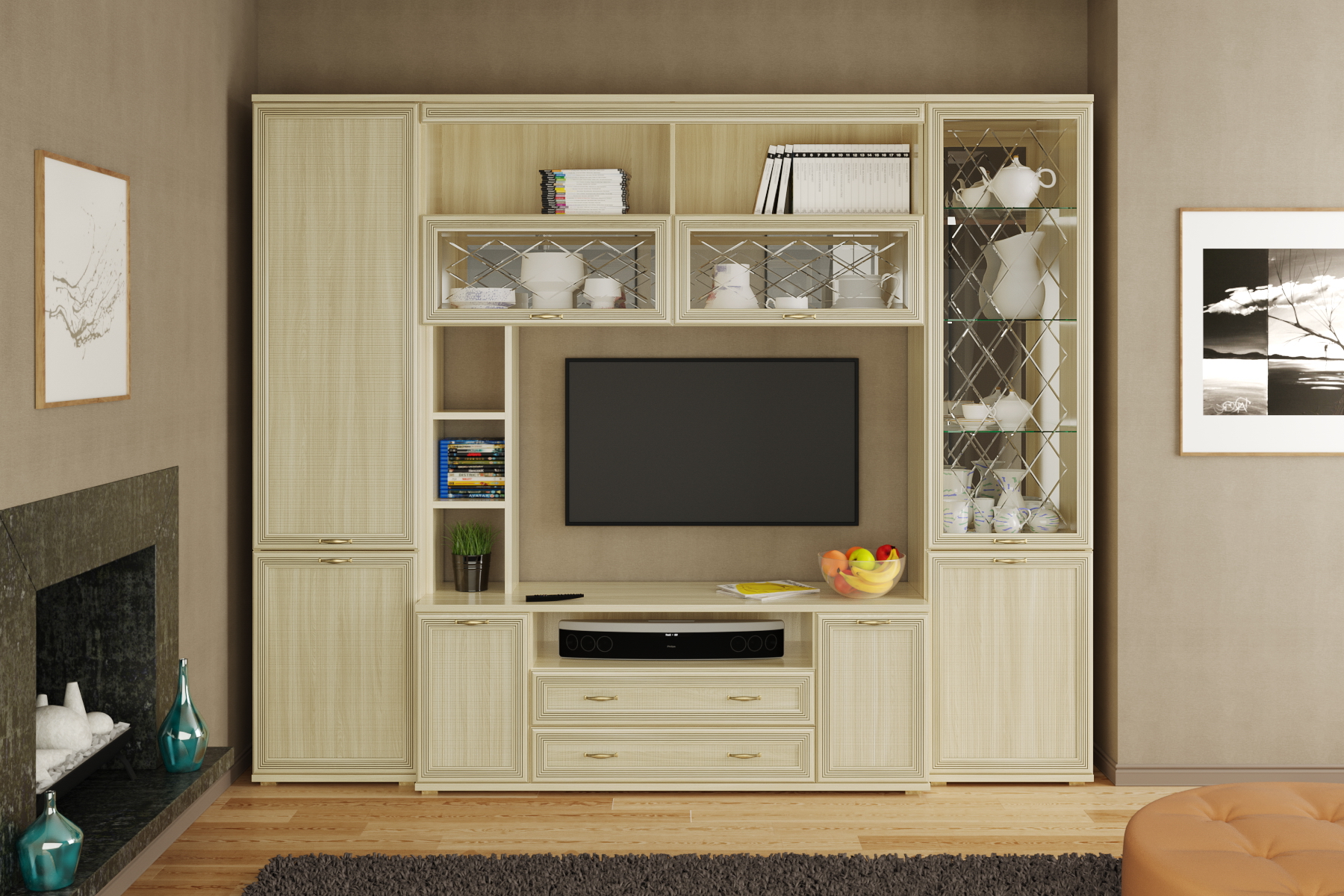 Корпусная мебель для гостиной "Карина" - это модульная мебель. Коллекция включает в себя более 70-ти оригинальных модулей, созданная с их помощью композиция отлично впишется в любое помещение. Программа «Карина» позволит создать уют и гармонию в гостиной. Фасад имеет уникальное сочетание глубокого тиснения и эффекта патины, присущей классическому стилю. Изящество фасада подчеркивает стекло с алмазной гравировкой и фацетом. Мебель изготавливается из высококачественных материалов: ЛДСП, МДФ (фасад) компании Egger имеют класс эмиссии Е1. Коллекция мебели комплектуется высококачественной европейской фурнитурой. Во всех выдвижных ящиках используются направляющие Quadro фирмы Hettich, которые обеспечат долгую превосходную функциональность. Встроенный демпфер Silent System позволяет закрывать ящик плавно и бесшумно. Скрытый монтаж делает механизм в нижней части ящика невидимым глазу, что позволяет не нарушать элегантный дизайн. Петли с доводчиками фирмы Titus обеспечивают бесшумное закрытие створки.