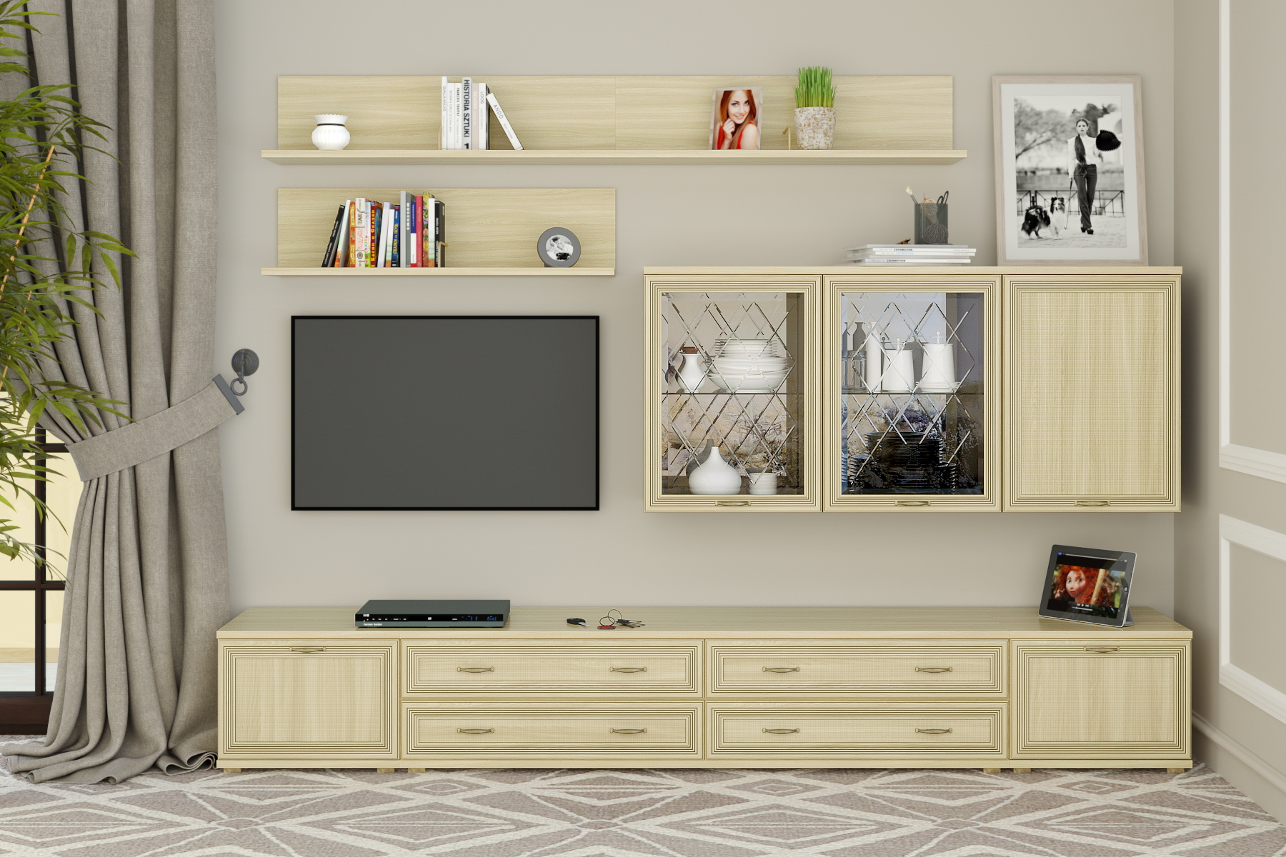 Корпусная мебель для гостиной "Карина" - это модульная мебель. Коллекция включает в себя более 70-ти оригинальных модулей, созданная с их помощью композиция отлично впишется в любое помещение. Программа «Карина» позволит создать уют и гармонию в гостиной. Фасад имеет уникальное сочетание глубокого тиснения и эффекта патины, присущей классическому стилю. Изящество фасада подчеркивает стекло с алмазной гравировкой и фацетом. Мебель изготавливается из высококачественных материалов: ЛДСП, МДФ (фасад) компании Egger имеют класс эмиссии Е1. Коллекция мебели комплектуется высококачественной европейской фурнитурой. Во всех выдвижных ящиках используются направляющие Quadro фирмы Hettich, которые обеспечат долгую превосходную функциональность. Встроенный демпфер Silent System позволяет закрывать ящик плавно и бесшумно. Скрытый монтаж делает механизм в нижней части ящика невидимым глазу, что позволяет не нарушать элегантный дизайн. Петли с доводчиками фирмы Titus обеспечивают бесшумное закрытие створки.