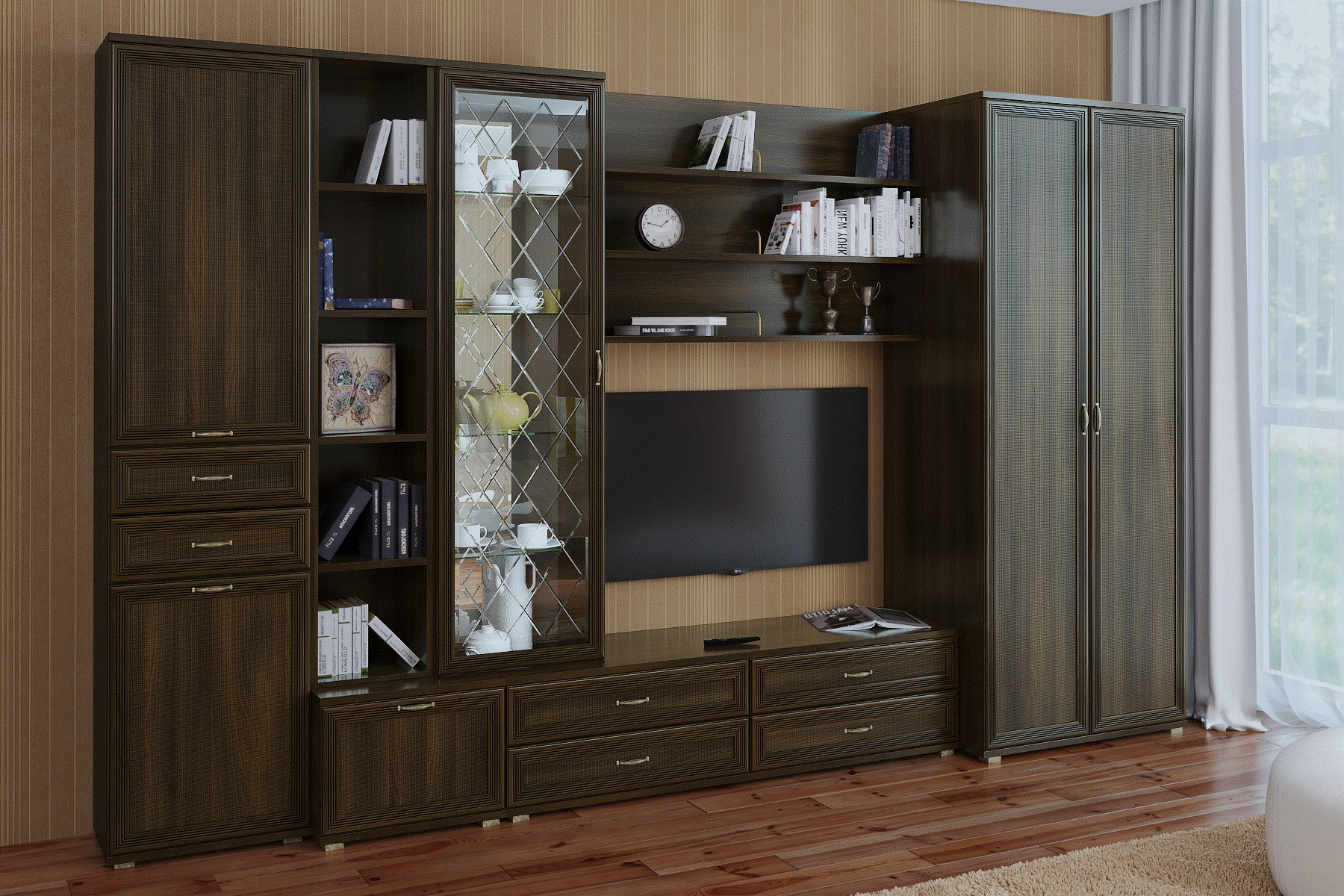 Корпусная мебель для гостиной "Карина" - это модульная мебель. Коллекция включает в себя более 70-ти оригинальных модулей, созданная с их помощью композиция отлично впишется в любое помещение. Программа «Карина» позволит создать уют и гармонию в гостиной. Фасад имеет уникальное сочетание глубокого тиснения и эффекта патины, присущей классическому стилю. Изящество фасада подчеркивает стекло с алмазной гравировкой и фацетом. Мебель изготавливается из высококачественных материалов: ЛДСП, МДФ (фасад) компании Egger имеют класс эмиссии Е1. Коллекция мебели комплектуется высококачественной европейской фурнитурой. Во всех выдвижных ящиках используются направляющие Quadro фирмы Hettich, которые обеспечат долгую превосходную функциональность. Встроенный демпфер Silent System позволяет закрывать ящик плавно и бесшумно. Скрытый монтаж делает механизм в нижней части ящика невидимым глазу, что позволяет не нарушать элегантный дизайн. Петли с доводчиками фирмы Titus обеспечивают бесшумное закрытие створки.