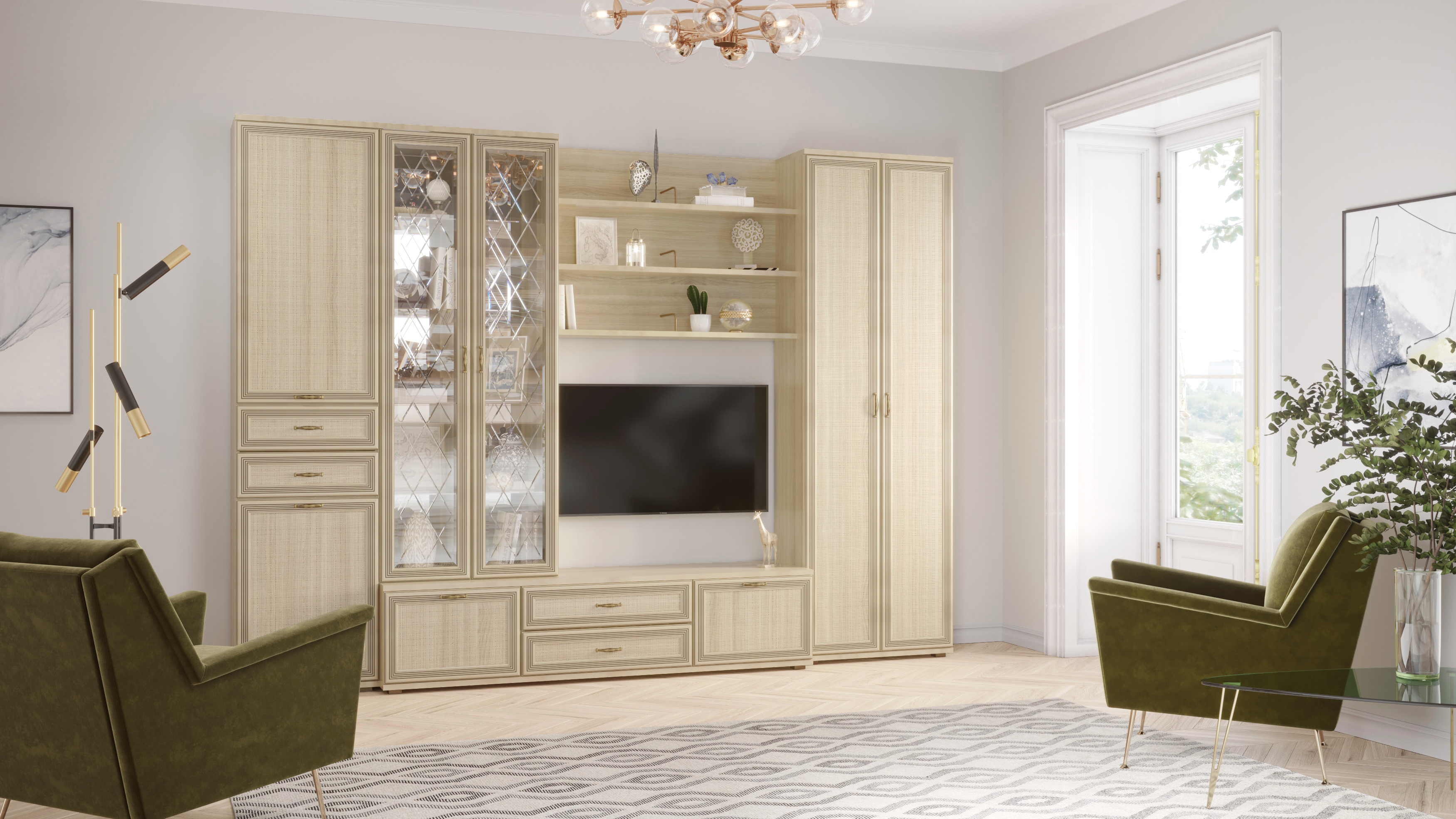 Корпусная мебель для гостиной "Карина" - это модульная мебель. Коллекция включает в себя более 70-ти оригинальных модулей, созданная с их помощью композиция отлично впишется в любое помещение. Программа «Карина» позволит создать уют и гармонию в гостиной. Фасад имеет уникальное сочетание глубокого тиснения и эффекта патины, присущей классическому стилю. Изящество фасада подчеркивает стекло с алмазной гравировкой и фацетом. Мебель изготавливается из высококачественных материалов: ЛДСП, МДФ (фасад) компании Egger имеют класс эмиссии Е1. Коллекция мебели комплектуется высококачественной европейской фурнитурой. Во всех выдвижных ящиках используются направляющие Quadro фирмы Hettich, которые обеспечат долгую превосходную функциональность. Встроенный демпфер Silent System позволяет закрывать ящик плавно и бесшумно. Скрытый монтаж делает механизм в нижней части ящика невидимым глазу, что позволяет не нарушать элегантный дизайн. Петли с доводчиками фирмы Titus обеспечивают бесшумное закрытие створки.