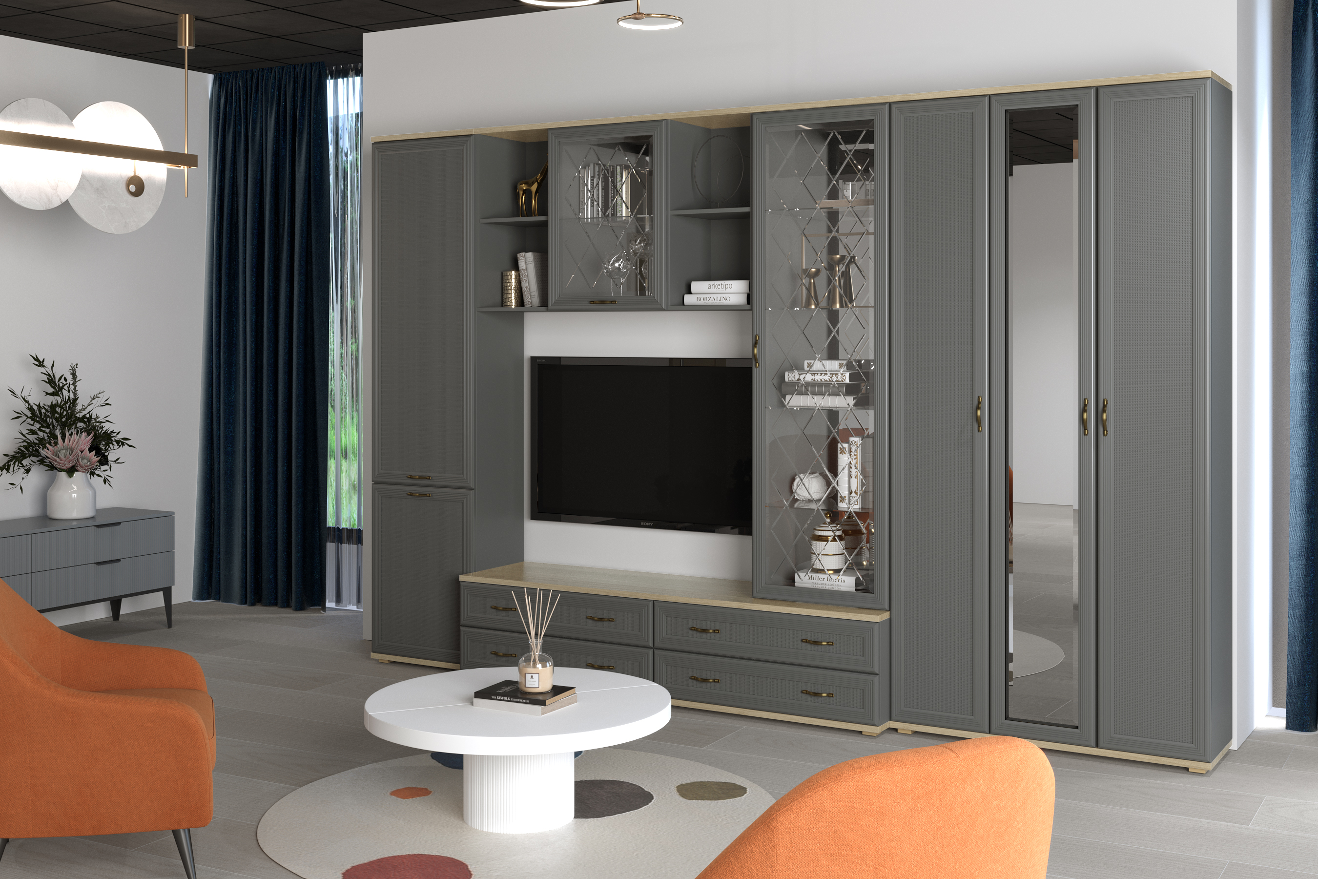Корпусная мебель для гостиной "Карина" - это модульная мебель. Коллекция включает в себя более 70-ти оригинальных модулей, созданная с их помощью композиция отлично впишется в любое помещение. Программа «Карина» позволит создать уют и гармонию в гостиной. Фасад имеет уникальное сочетание глубокого тиснения и эффекта патины, присущей классическому стилю. Изящество фасада подчеркивает стекло с алмазной гравировкой и фацетом. Мебель изготавливается из высококачественных материалов: ЛДСП, МДФ (фасад) компании Egger имеют класс эмиссии Е1. Коллекция мебели комплектуется высококачественной европейской фурнитурой. Во всех выдвижных ящиках используются направляющие Quadro фирмы Hettich, которые обеспечат долгую превосходную функциональность. Встроенный демпфер Silent System позволяет закрывать ящик плавно и бесшумно. Скрытый монтаж делает механизм в нижней части ящика невидимым глазу, что позволяет не нарушать элегантный дизайн. Петли с доводчиками фирмы Titus обеспечивают бесшумное закрытие створки.
