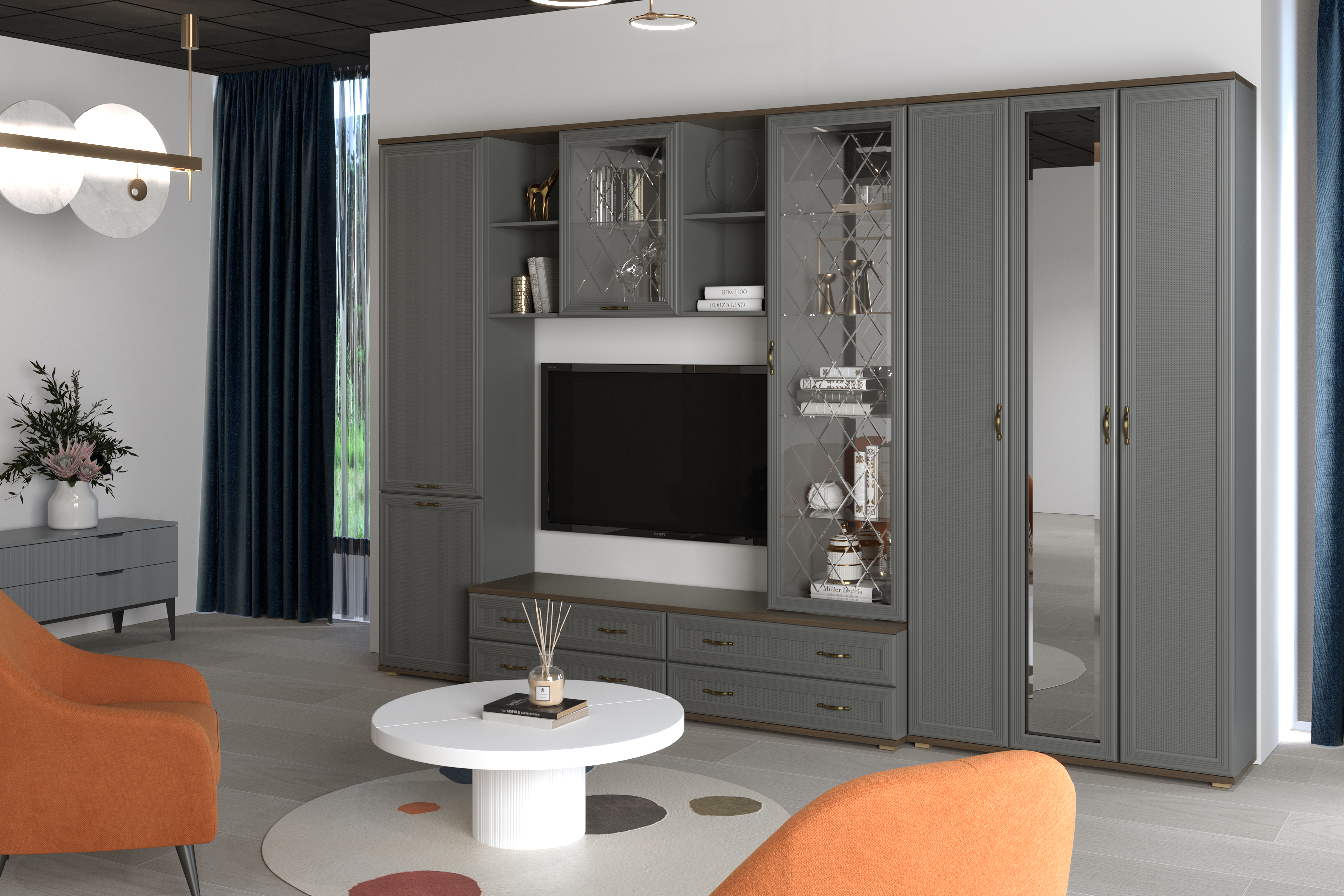 Корпусная мебель для гостиной "Карина" - это модульная мебель. Коллекция включает в себя более 70-ти оригинальных модулей, созданная с их помощью композиция отлично впишется в любое помещение. Программа «Карина» позволит создать уют и гармонию в гостиной. Фасад имеет уникальное сочетание глубокого тиснения и эффекта патины, присущей классическому стилю. Изящество фасада подчеркивает стекло с алмазной гравировкой и фацетом. Мебель изготавливается из высококачественных материалов: ЛДСП, МДФ (фасад) компании Egger имеют класс эмиссии Е1. Коллекция мебели комплектуется высококачественной европейской фурнитурой. Во всех выдвижных ящиках используются направляющие Quadro фирмы Hettich, которые обеспечат долгую превосходную функциональность. Встроенный демпфер Silent System позволяет закрывать ящик плавно и бесшумно. Скрытый монтаж делает механизм в нижней части ящика невидимым глазу, что позволяет не нарушать элегантный дизайн. Петли с доводчиками фирмы Titus обеспечивают бесшумное закрытие створки.