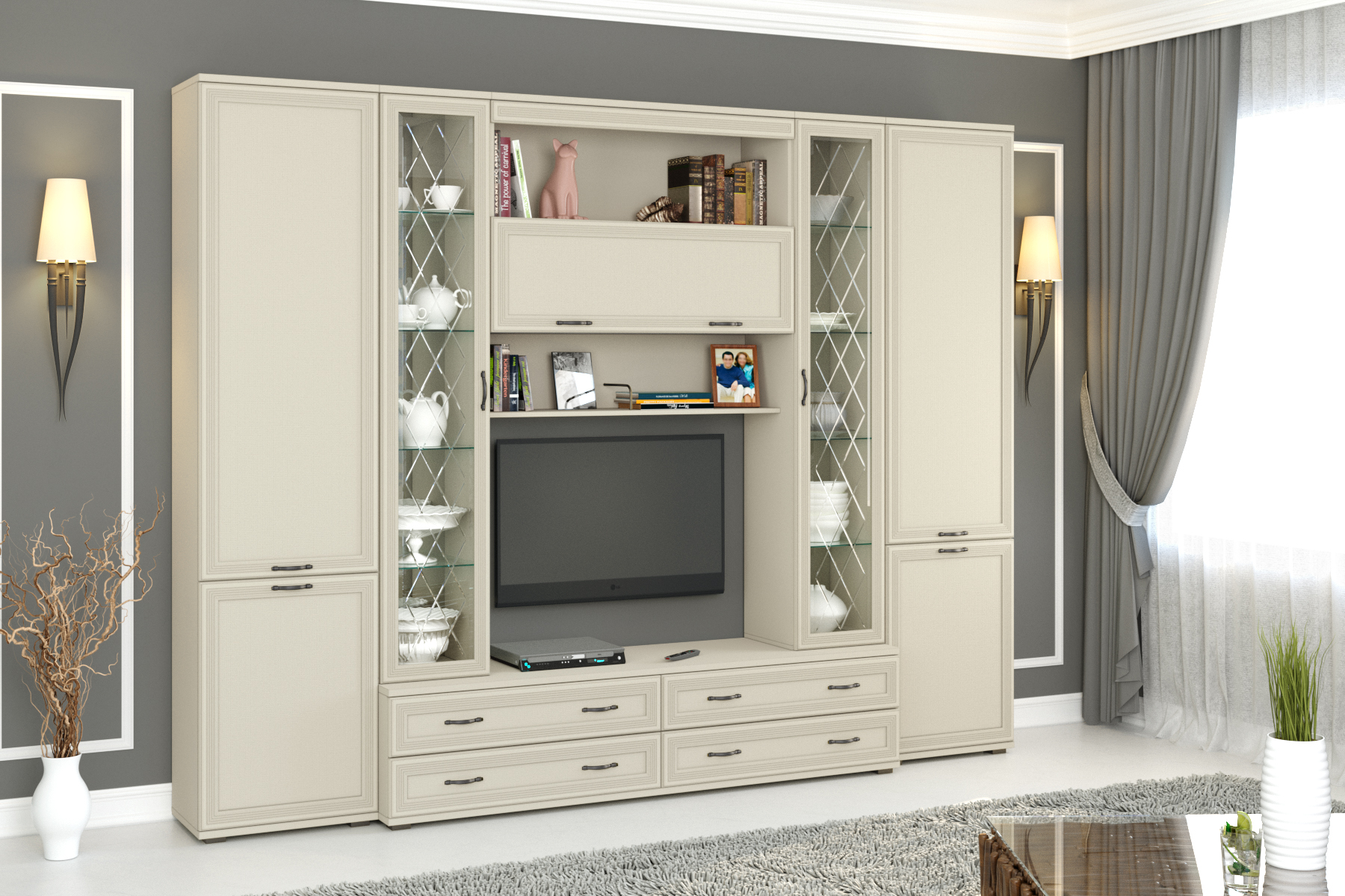 Корпусная мебель для гостиной "Карина" - это модульная мебель. Коллекция включает в себя более 70-ти оригинальных модулей, созданная с их помощью композиция отлично впишется в любое помещение. Программа «Карина» позволит создать уют и гармонию в гостиной. Фасад имеет уникальное сочетание глубокого тиснения и эффекта патины, присущей классическому стилю. Изящество фасада подчеркивает стекло с алмазной гравировкой и фацетом. Мебель изготавливается из высококачественных материалов: ЛДСП, МДФ (фасад) компании Egger имеют класс эмиссии Е1. Коллекция мебели комплектуется высококачественной европейской фурнитурой. Во всех выдвижных ящиках используются направляющие Quadro фирмы Hettich, которые обеспечат долгую превосходную функциональность. Встроенный демпфер Silent System позволяет закрывать ящик плавно и бесшумно. Скрытый монтаж делает механизм в нижней части ящика невидимым глазу, что позволяет не нарушать элегантный дизайн. Петли с доводчиками фирмы Titus обеспечивают бесшумное закрытие створки.