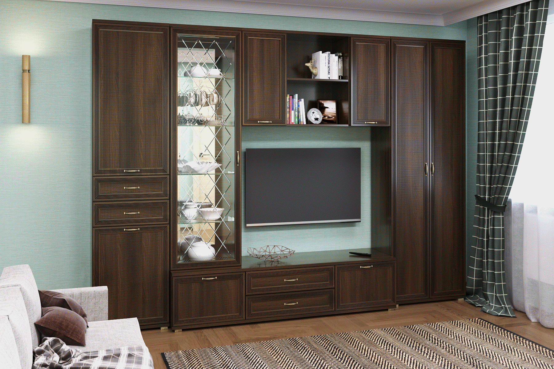 Корпусная мебель для гостиной "Карина" - это модульная мебель. Коллекция включает в себя более 70-ти оригинальных модулей, созданная с их помощью композиция отлично впишется в любое помещение. Программа «Карина» позволит создать уют и гармонию в гостиной. Фасад имеет уникальное сочетание глубокого тиснения и эффекта патины, присущей классическому стилю. Изящество фасада подчеркивает стекло с алмазной гравировкой и фацетом. Мебель изготавливается из высококачественных материалов: ЛДСП, МДФ (фасад) компании Egger имеют класс эмиссии Е1. Коллекция мебели комплектуется высококачественной европейской фурнитурой. Во всех выдвижных ящиках используются направляющие Quadro фирмы Hettich, которые обеспечат долгую превосходную функциональность. Встроенный демпфер Silent System позволяет закрывать ящик плавно и бесшумно. Скрытый монтаж делает механизм в нижней части ящика невидимым глазу, что позволяет не нарушать элегантный дизайн. Петли с доводчиками фирмы Titus обеспечивают бесшумное закрытие створки.