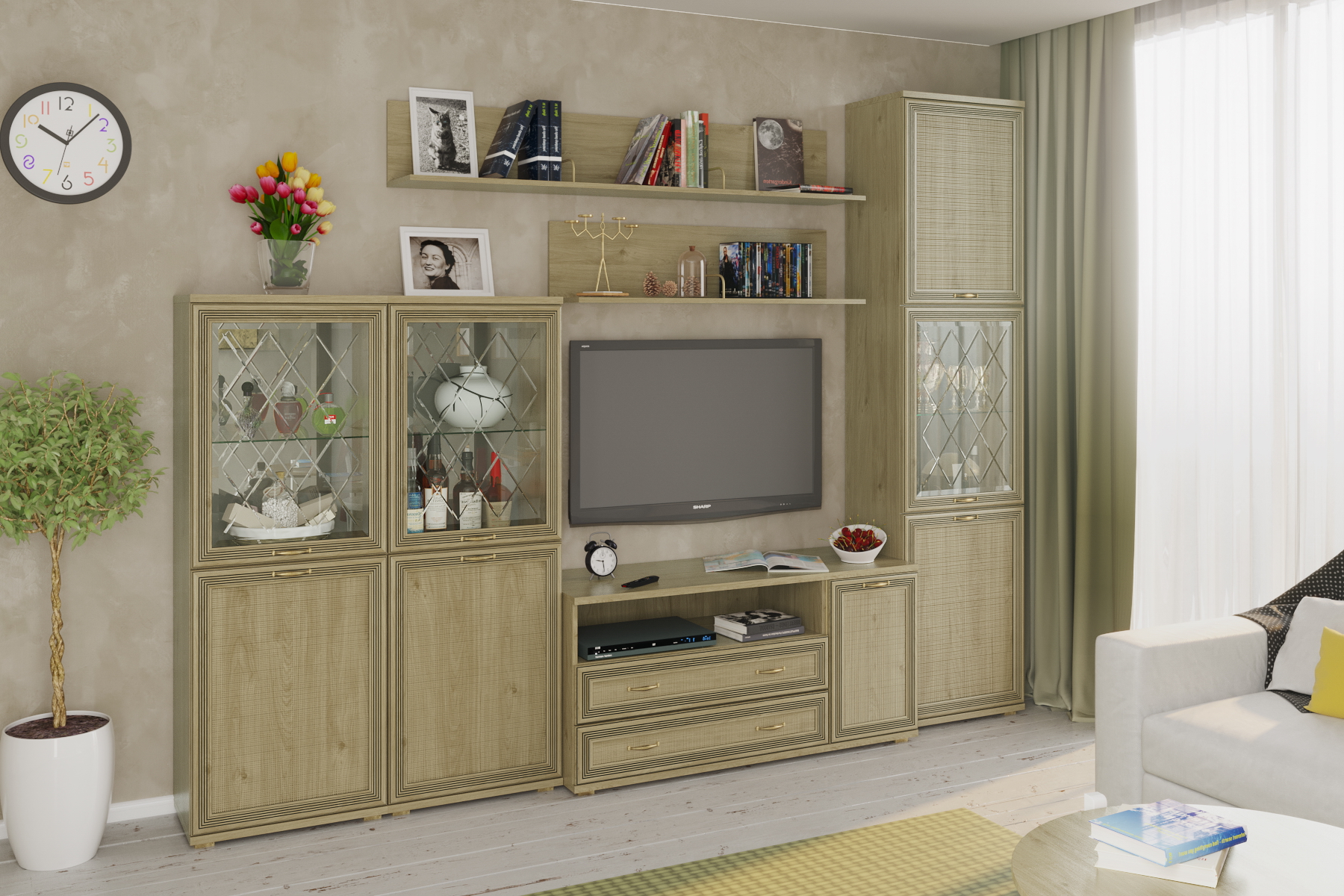 Корпусная мебель для гостиной "Карина" - это модульная мебель. Коллекция включает в себя более 70-ти оригинальных модулей, созданная с их помощью композиция отлично впишется в любое помещение. Программа «Карина» позволит создать уют и гармонию в гостиной. Фасад имеет уникальное сочетание глубокого тиснения и эффекта патины, присущей классическому стилю. Изящество фасада подчеркивает стекло с алмазной гравировкой и фацетом. Мебель изготавливается из высококачественных материалов: ЛДСП, МДФ (фасад) компании Egger имеют класс эмиссии Е1. Коллекция мебели комплектуется высококачественной европейской фурнитурой. Во всех выдвижных ящиках используются направляющие Quadro фирмы Hettich, которые обеспечат долгую превосходную функциональность. Встроенный демпфер Silent System позволяет закрывать ящик плавно и бесшумно. Скрытый монтаж делает механизм в нижней части ящика невидимым глазу, что позволяет не нарушать элегантный дизайн. Петли с доводчиками фирмы Titus обеспечивают бесшумное закрытие створки.