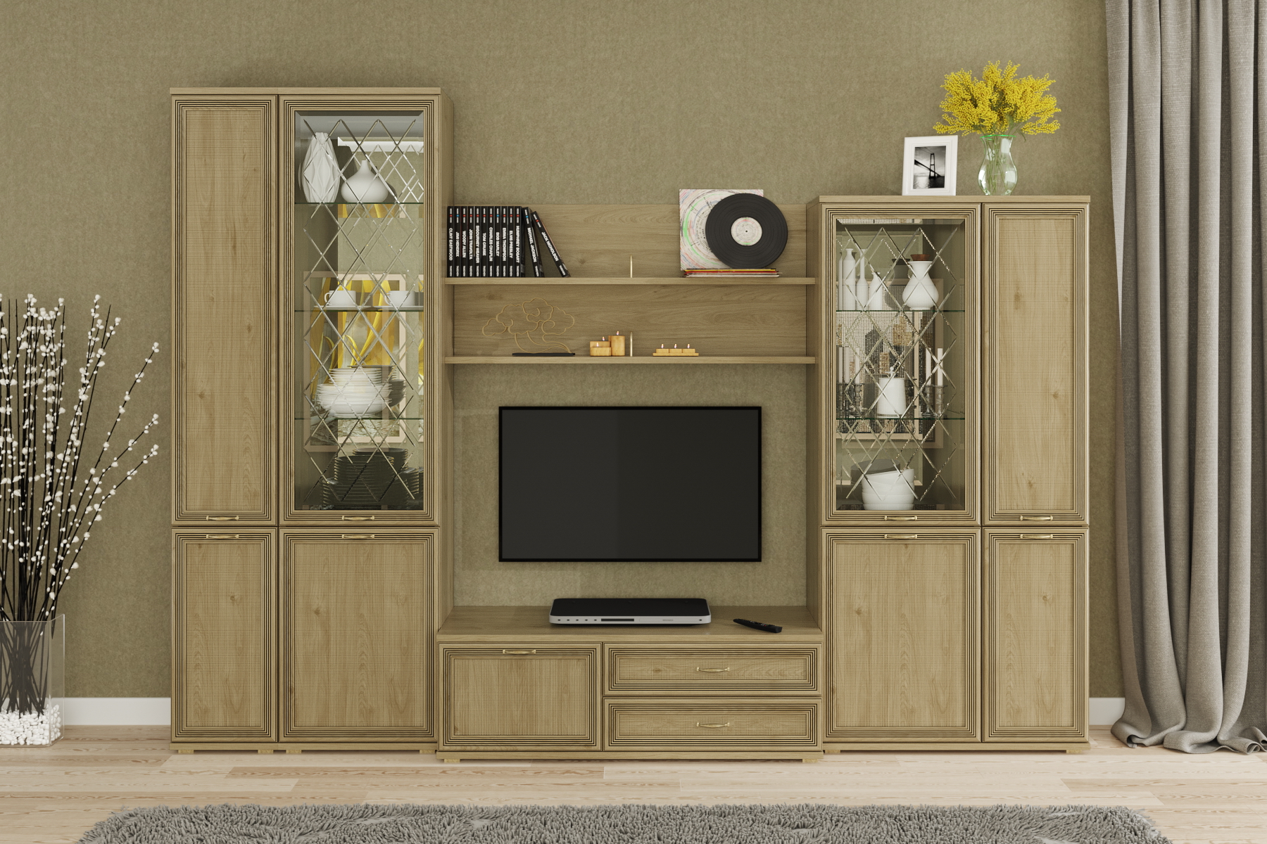 Корпусная мебель для гостиной "Карина" - это модульная мебель. Коллекция включает в себя более 70-ти оригинальных модулей, созданная с их помощью композиция отлично впишется в любое помещение. Программа «Карина» позволит создать уют и гармонию в гостиной. Фасад имеет уникальное сочетание глубокого тиснения и эффекта патины, присущей классическому стилю. Изящество фасада подчеркивает стекло с алмазной гравировкой и фацетом. Мебель изготавливается из высококачественных материалов: ЛДСП, МДФ (фасад) компании Egger имеют класс эмиссии Е1. Коллекция мебели комплектуется высококачественной европейской фурнитурой. Во всех выдвижных ящиках используются направляющие Quadro фирмы Hettich, которые обеспечат долгую превосходную функциональность. Встроенный демпфер Silent System позволяет закрывать ящик плавно и бесшумно. Скрытый монтаж делает механизм в нижней части ящика невидимым глазу, что позволяет не нарушать элегантный дизайн. Петли с доводчиками фирмы Titus обеспечивают бесшумное закрытие створки.