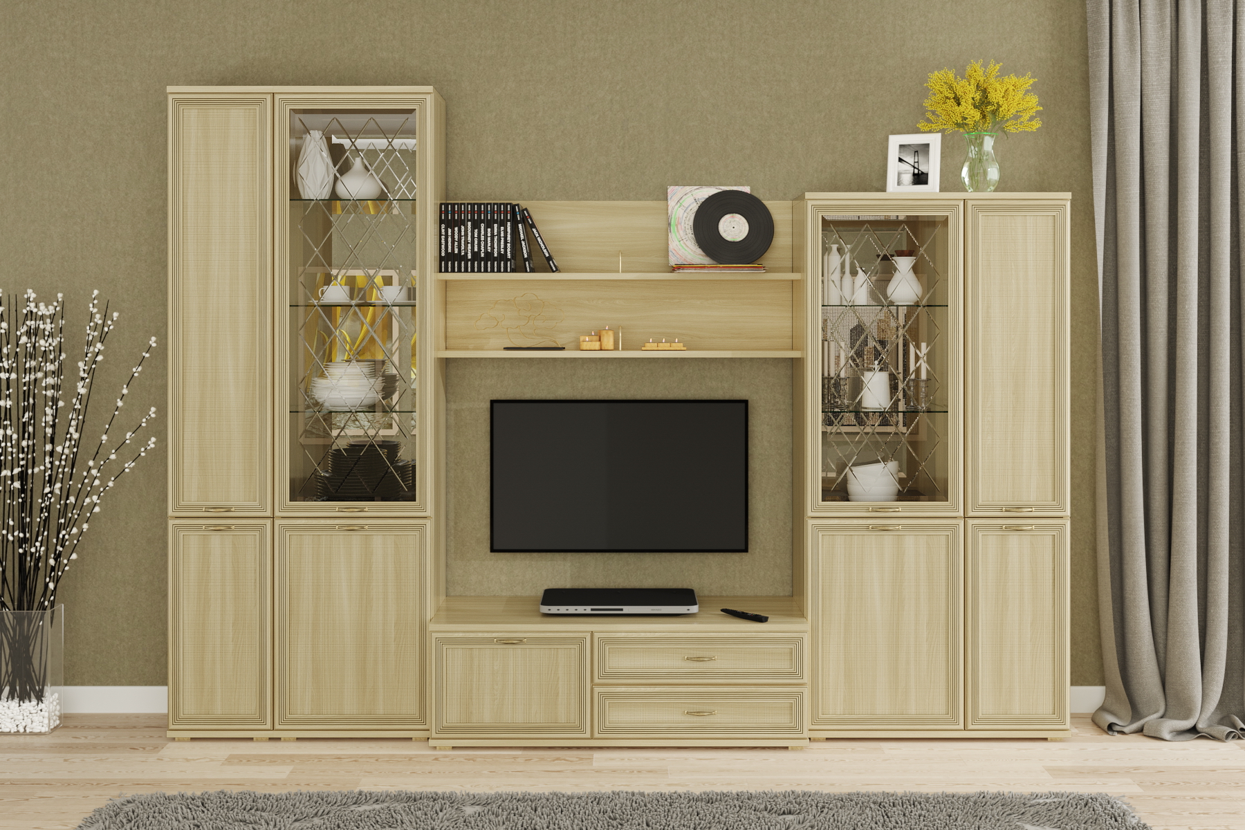 Корпусная мебель для гостиной "Карина" - это модульная мебель. Коллекция включает в себя более 70-ти оригинальных модулей, созданная с их помощью композиция отлично впишется в любое помещение. Программа «Карина» позволит создать уют и гармонию в гостиной. Фасад имеет уникальное сочетание глубокого тиснения и эффекта патины, присущей классическому стилю. Изящество фасада подчеркивает стекло с алмазной гравировкой и фацетом. Мебель изготавливается из высококачественных материалов: ЛДСП, МДФ (фасад) компании Egger имеют класс эмиссии Е1. Коллекция мебели комплектуется высококачественной европейской фурнитурой. Во всех выдвижных ящиках используются направляющие Quadro фирмы Hettich, которые обеспечат долгую превосходную функциональность. Встроенный демпфер Silent System позволяет закрывать ящик плавно и бесшумно. Скрытый монтаж делает механизм в нижней части ящика невидимым глазу, что позволяет не нарушать элегантный дизайн. Петли с доводчиками фирмы Titus обеспечивают бесшумное закрытие створки.