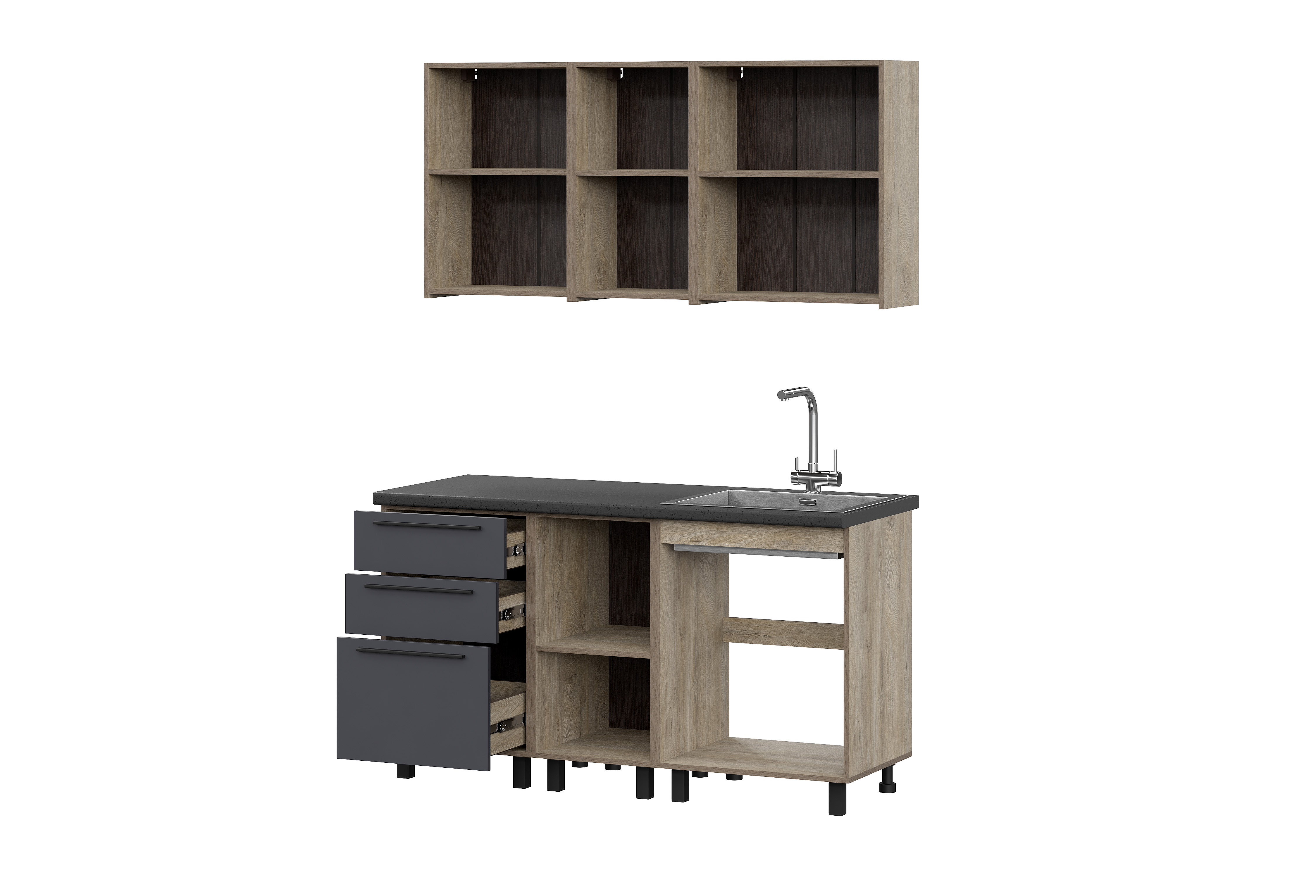 Модульная кухня Этна Софт Графит выполнена в современном стиле и сочетает в себе глубокий темно-серый оттенок фасадов и древесный декор корпуса. Актуальное исполнение, продуманное наполнение шкафов, фурнитура европейского качества. Особенностью выступают 3Д фасады Гиза.