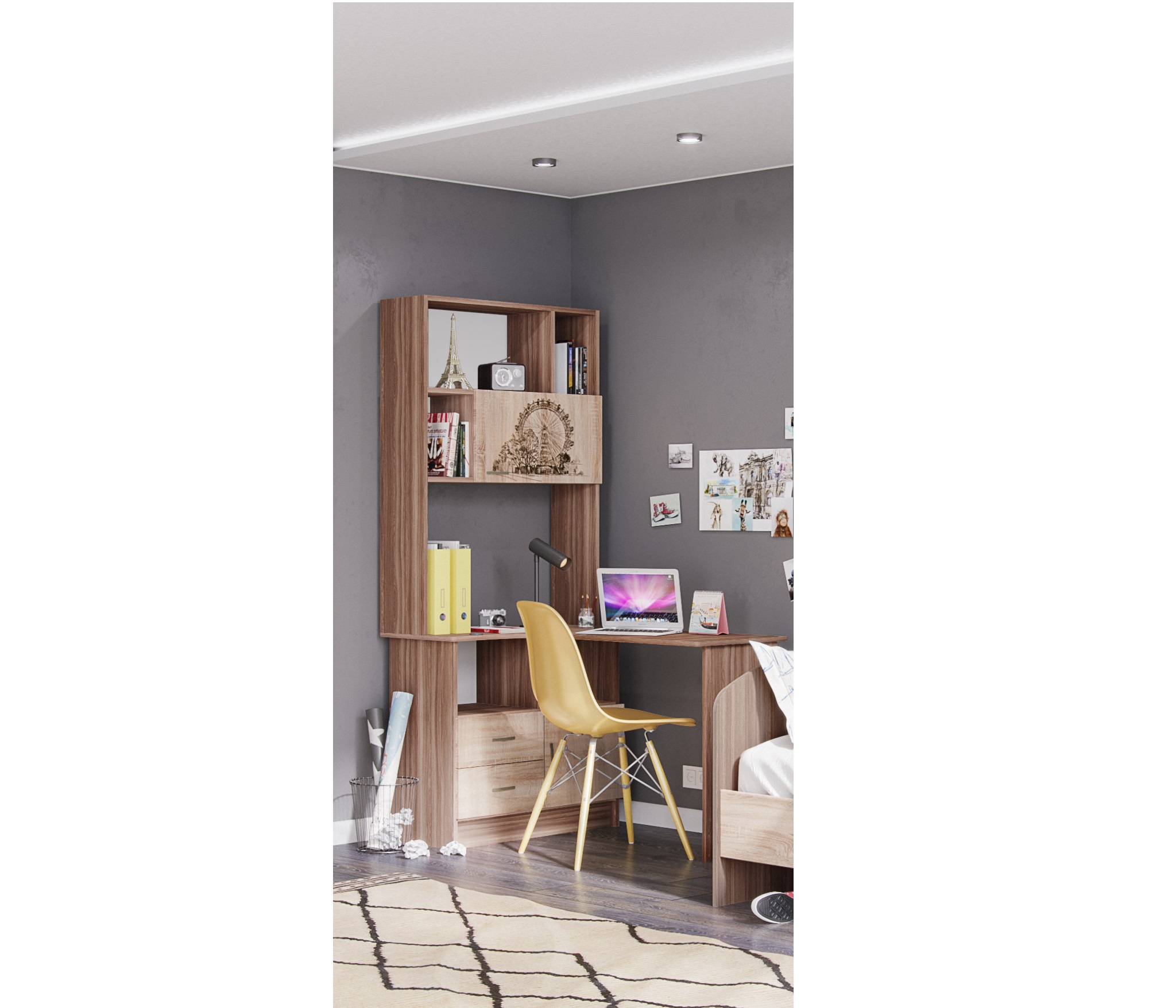 - Широкий выбор модулей: функциональные кровать-чердак и односпальная кровать, прикроватная тумба, разнообразие вместительных шкафов, угловое завершение, комод, навесная секция, письменный стол и стол с надстройкой.