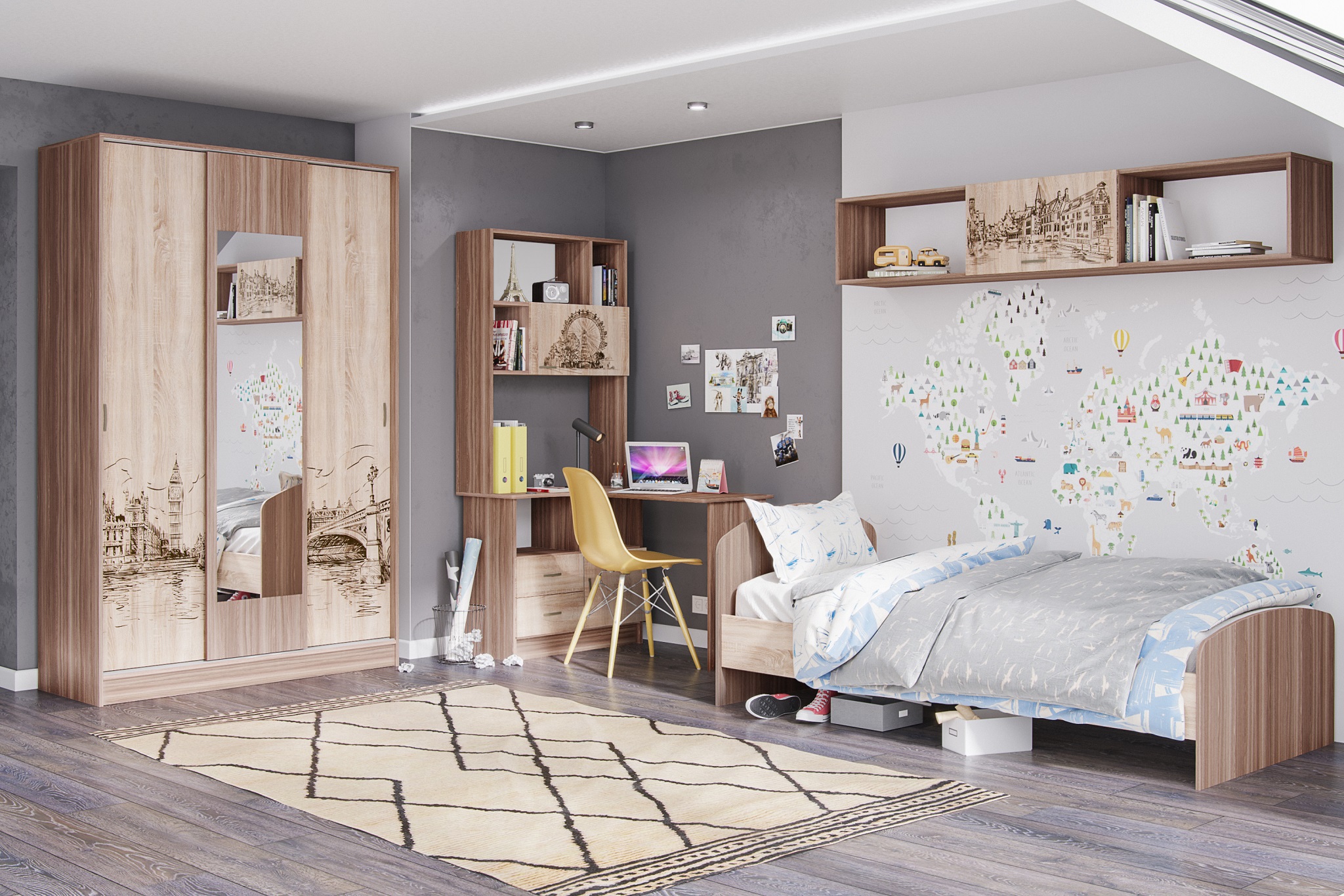 - Классические цвета исполнения Ясень шимо/Дуб Сонома в сочетании с дизайнерскими изображениями городов мира,