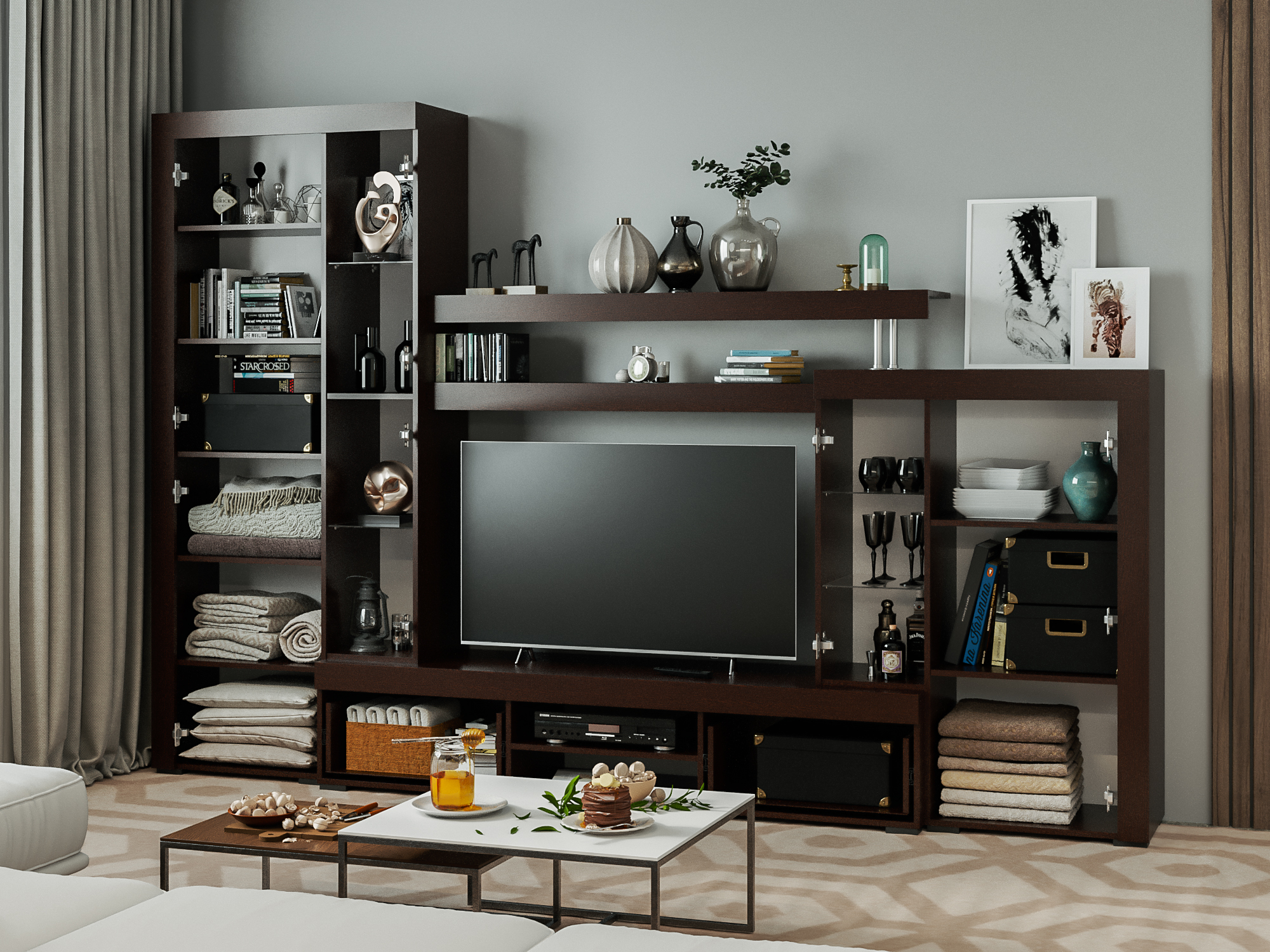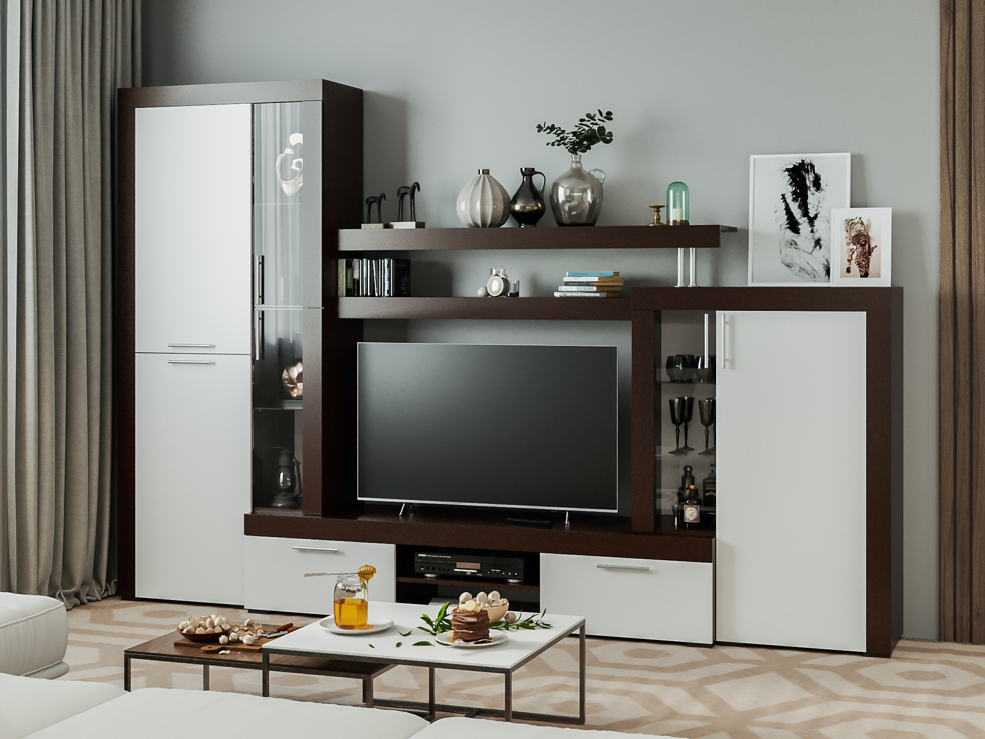Гарнитур включает широкий платяной шкаф с тремя отсеками, большую подвесную полку, пять ящиков с дверцами и множество небольших полочек. Открытые полки можно использовать под сувениры и фотографии, а застекленные витрины позволят в выгодном ракурсе представить красивую посуду и оригинальные аксессуары.