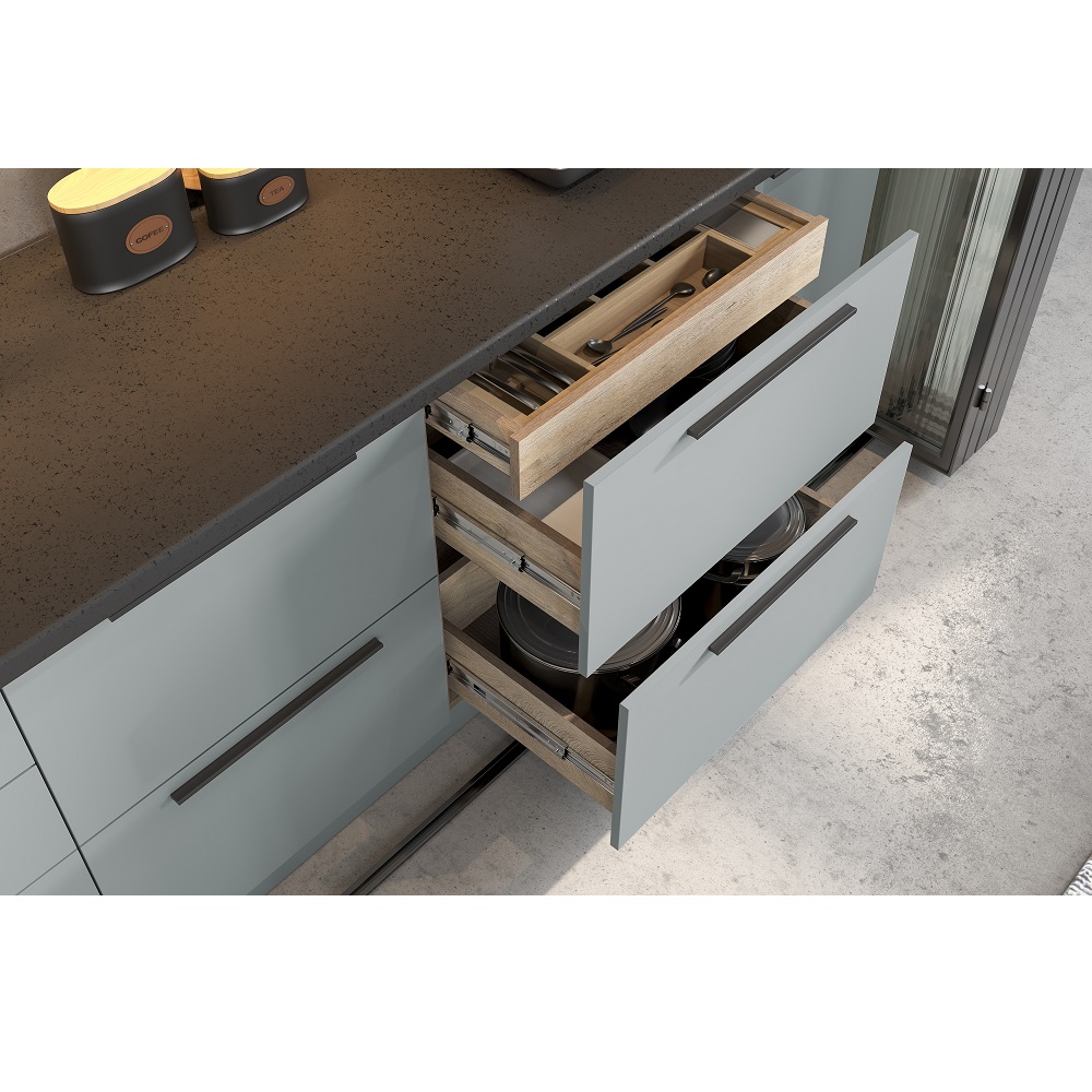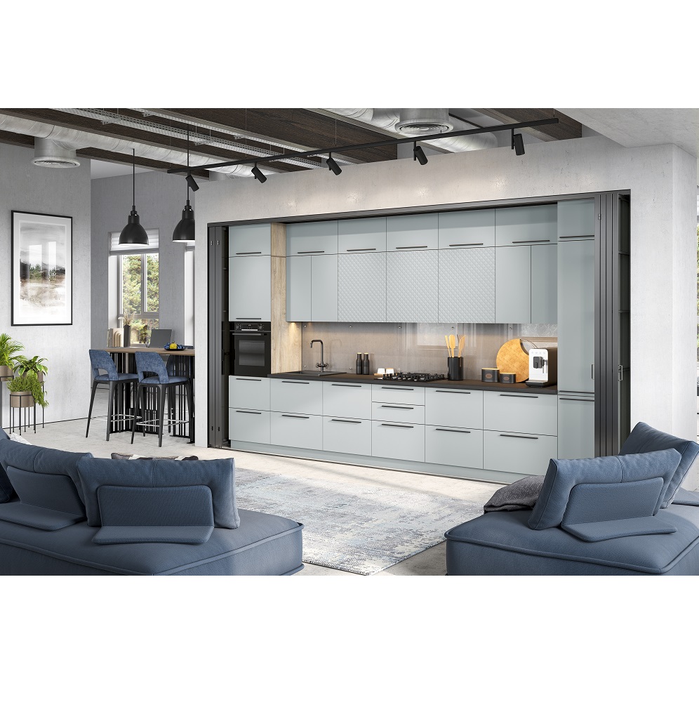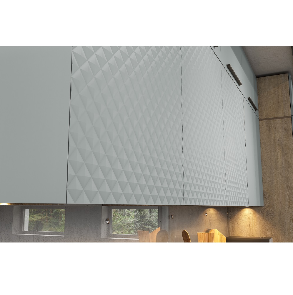 Модульная кухня Этна Софт Грей выполнена в самом трендовом декоре этого года – выбеленном нежно-сером оттенке с пудровой текстурой Soft. Такой декор фасадов гармонично дополняет корпус с древесным рисунком эндгрей необработанный. 3Д фасады Гиза выглядят стильно и создают оптические формы.