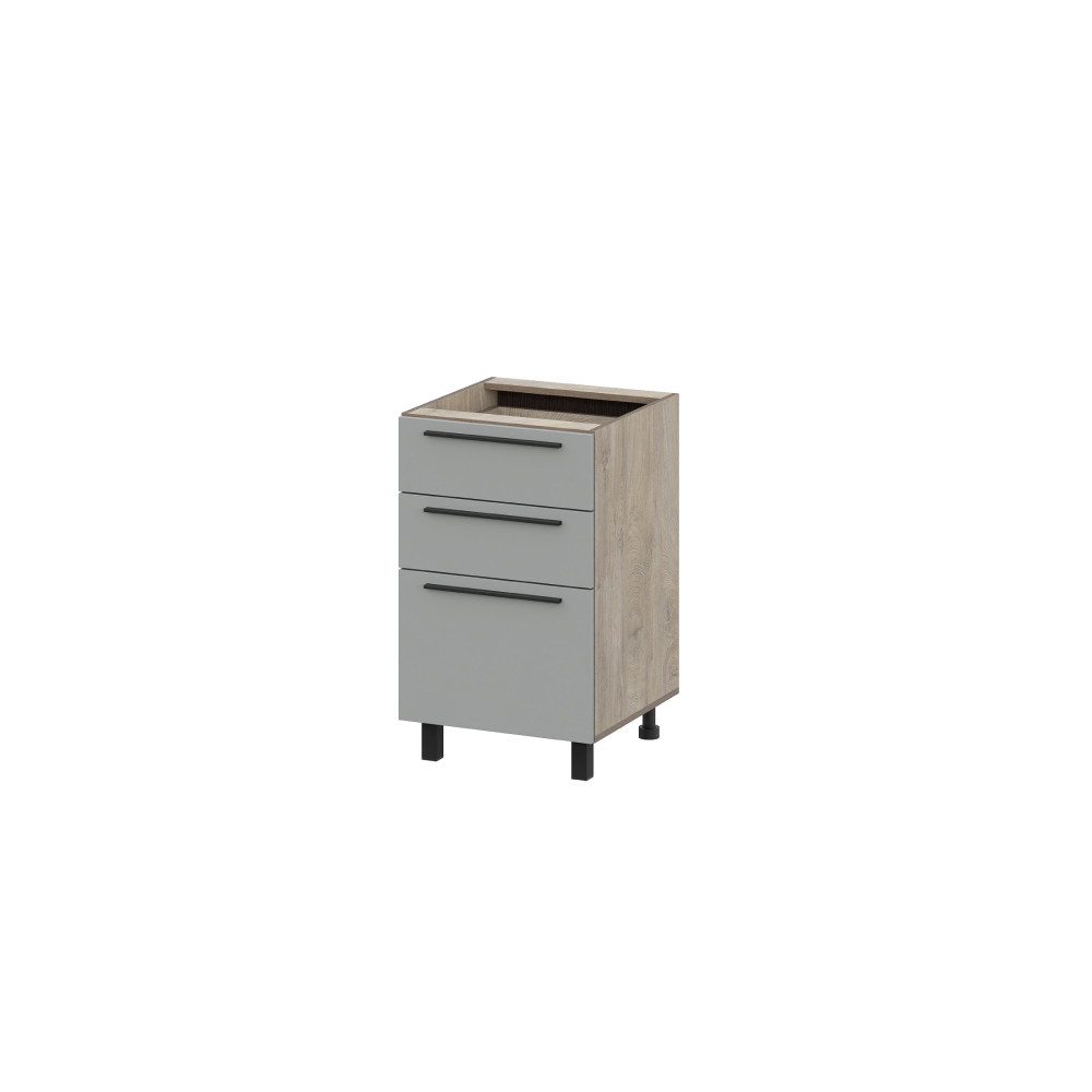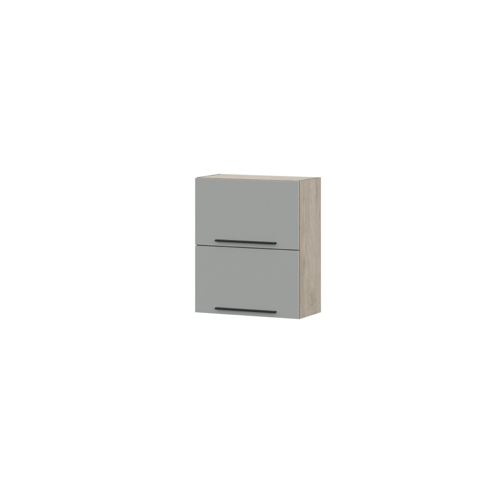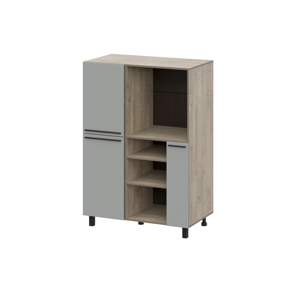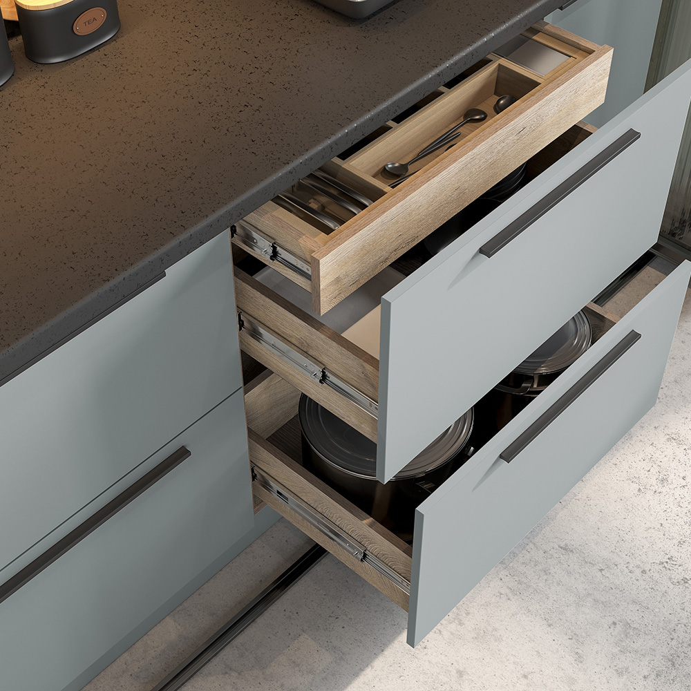 Модульная кухня Этна Софт Грей выполнена в популярном декоре – выбеленном нежно-сером оттенке с пудровой текстурой Soft. Такой декор фасадов гармонично дополняет корпус с древесным рисунком эндгрей необработанный.