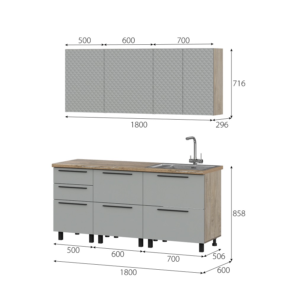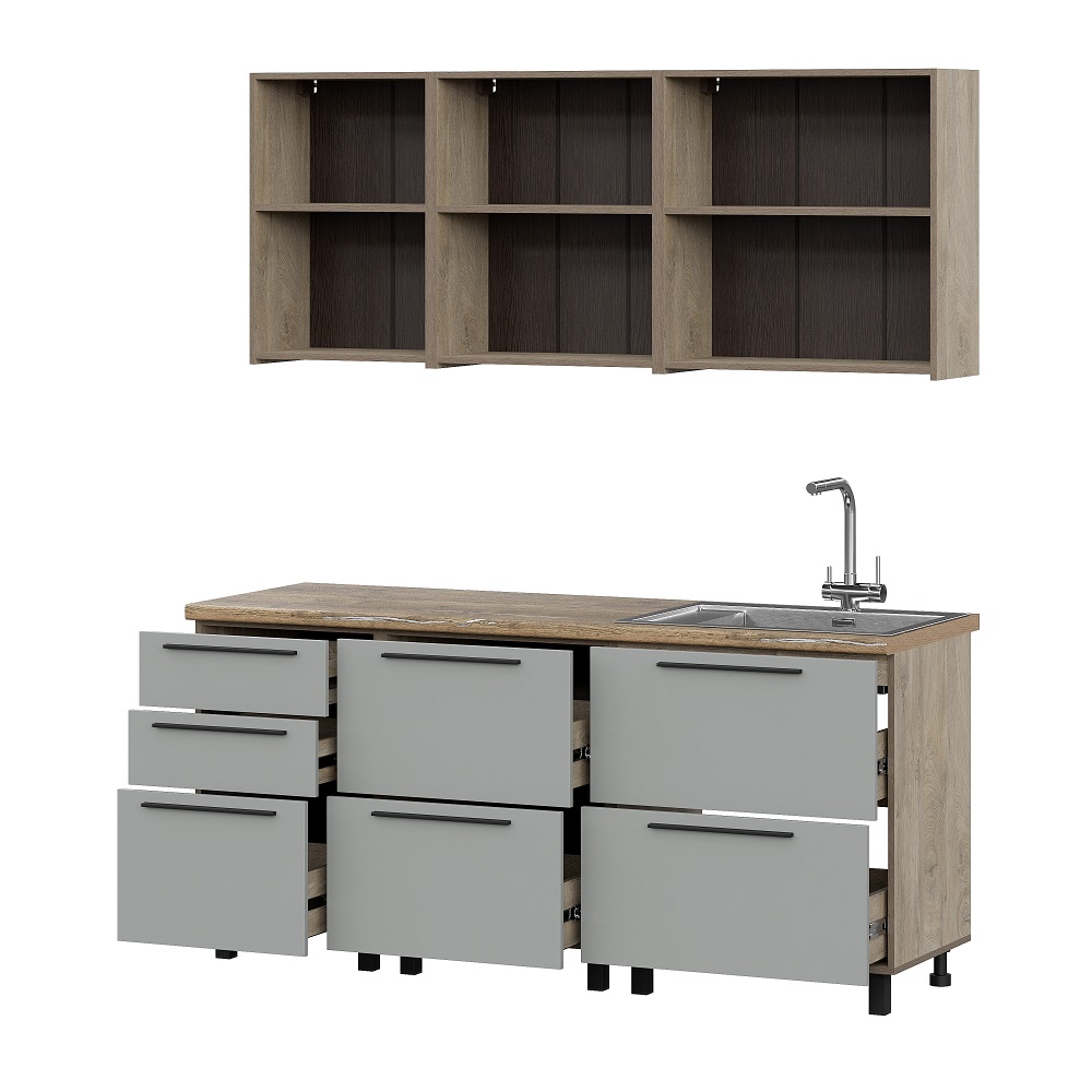 Модульная кухня Этна Софт Грей выполнена в самом трендовом декоре этого года – выбеленном нежно-сером оттенке с пудровой текстурой Soft. Такой декор фасадов гармонично дополняет корпус с древесным рисунком эндгрей необработанный.