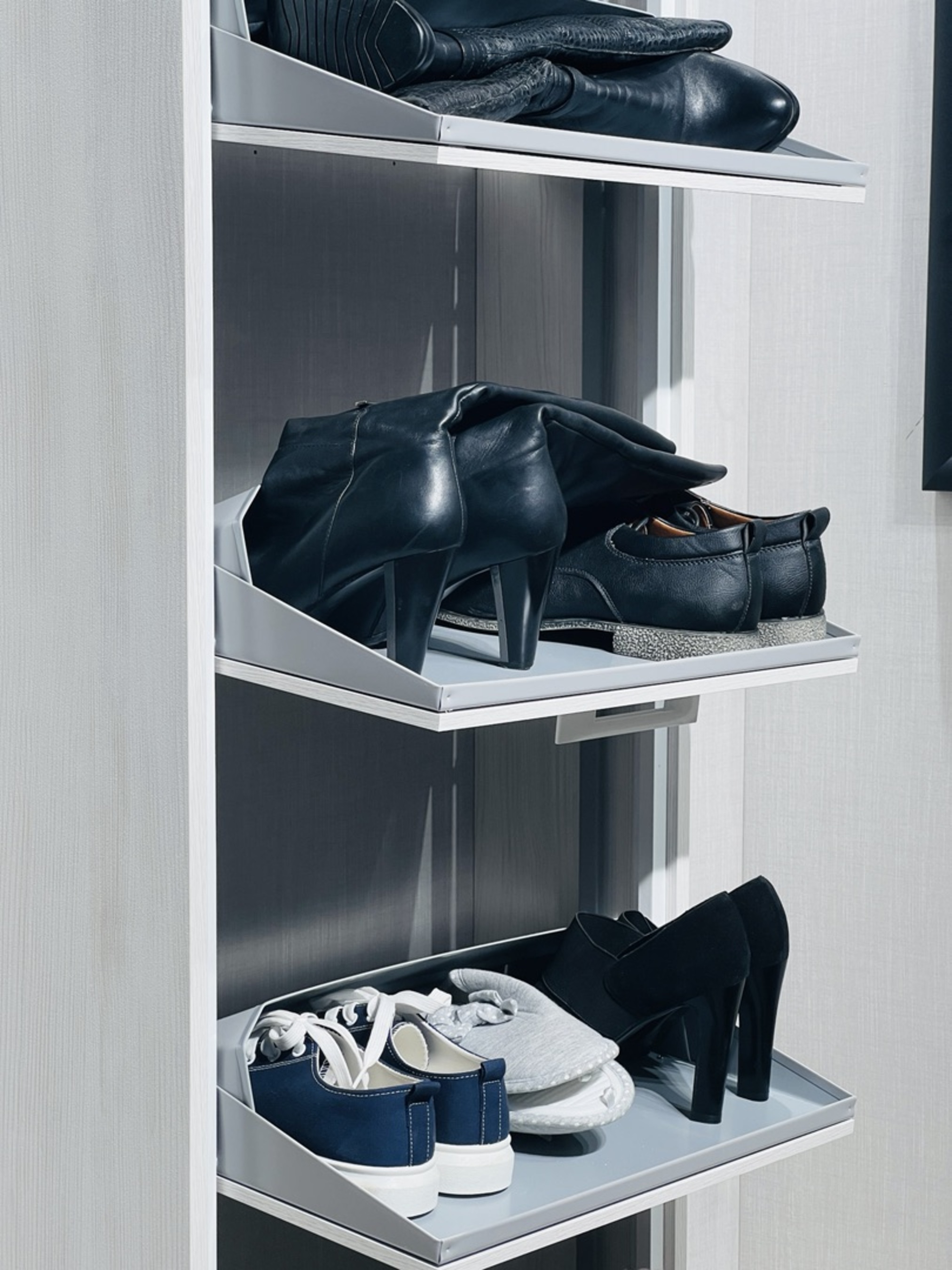 Наполнение шкафа выполнено из системы синхронного открывания из оцинкованного металла, цвет серый/белый. Алюминиевый профиль у системы цвет Белый, в независимости от цвета корпуса шкафа.