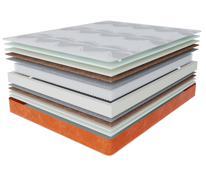 Для распределения нагрузки и придания необходимой жесткости используется латексированный кокосовый лист, который расположен под латексом.
