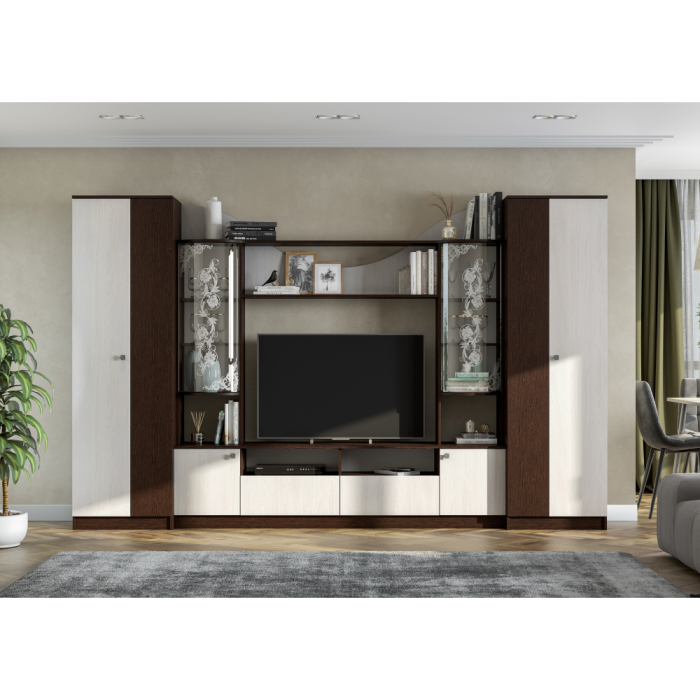 Элегантная модель для просторных гостиных. Контрастное цветовое решение фасадов в сочетании с декоративными стеклами.
