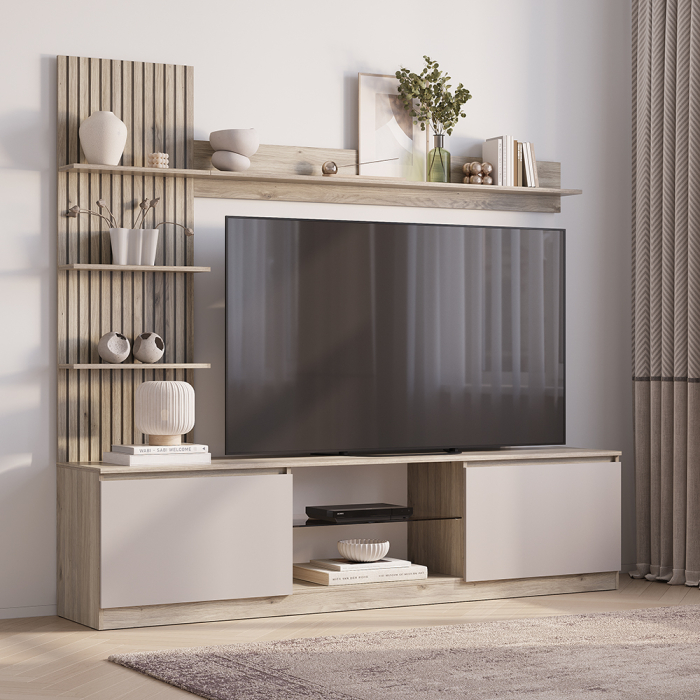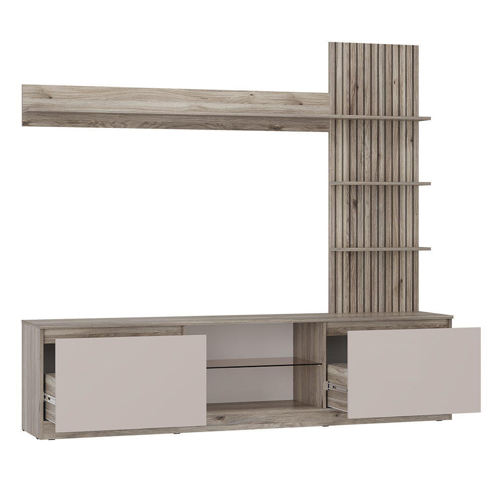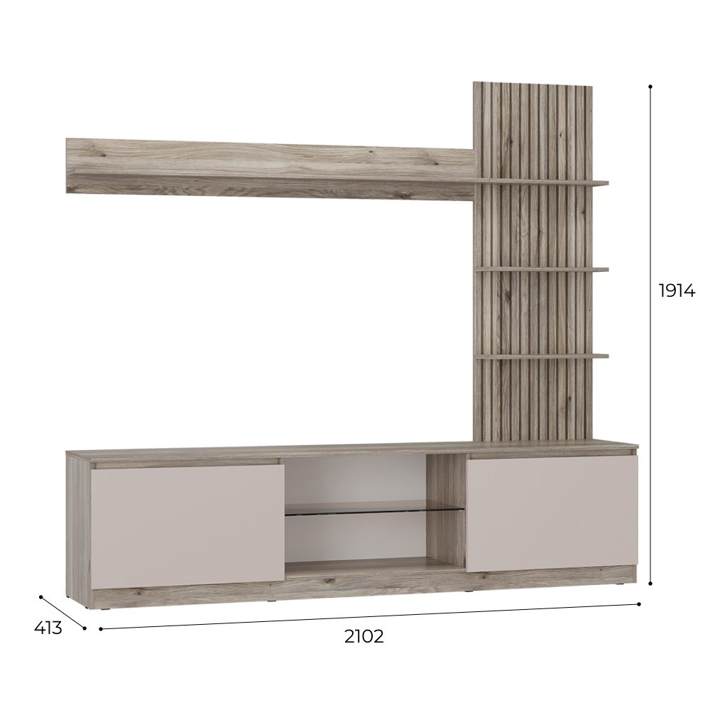 Компактная стенка Рио украсит вашу гостиную. Данная модель представляет собой единую конструкцию и включает в себя вместительную тумбу под ТВ, открытые полки для акустической системы и аксессуаров. Особенностью данной модели служит фотопечать с имитацией декоративных реек.